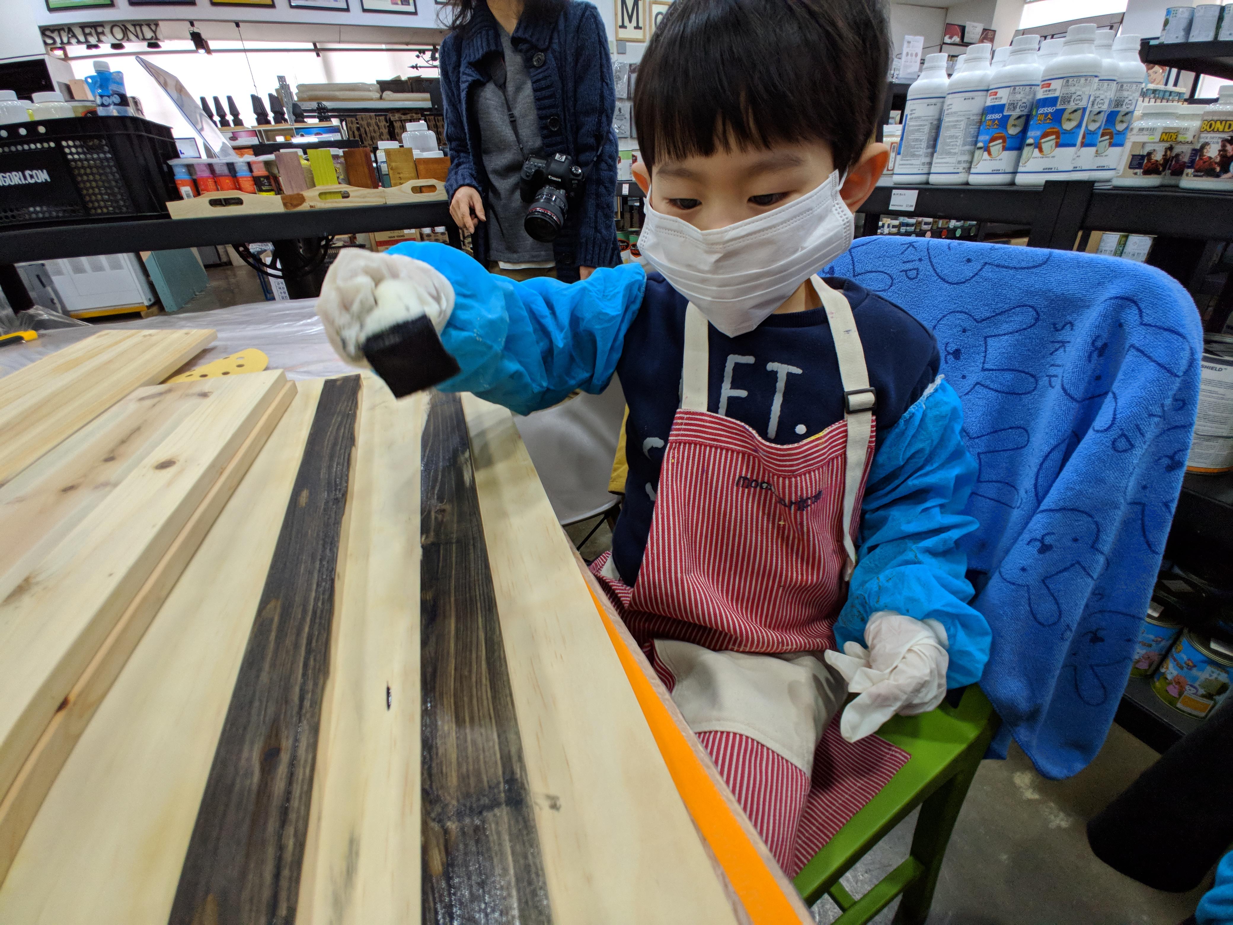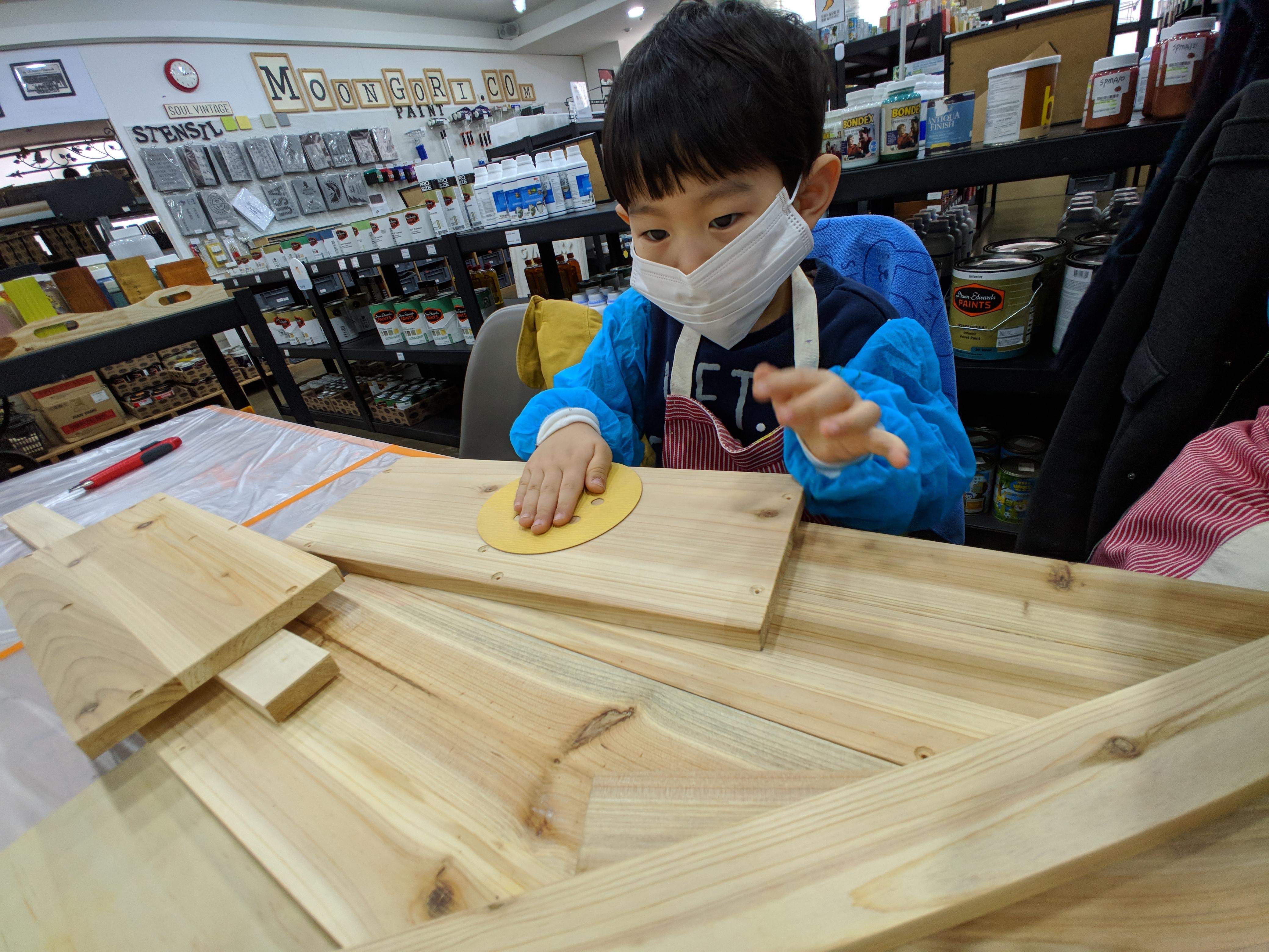 먼저 앞치마와 토시, 마스크를 착장했습니다. 나무에 사포질을 해야 해서 먼지가 많이 나서 마스크는 필수 였어요. 나무 결따라 사포질을 해서 표면을 부드럽게 해줬습니다.
