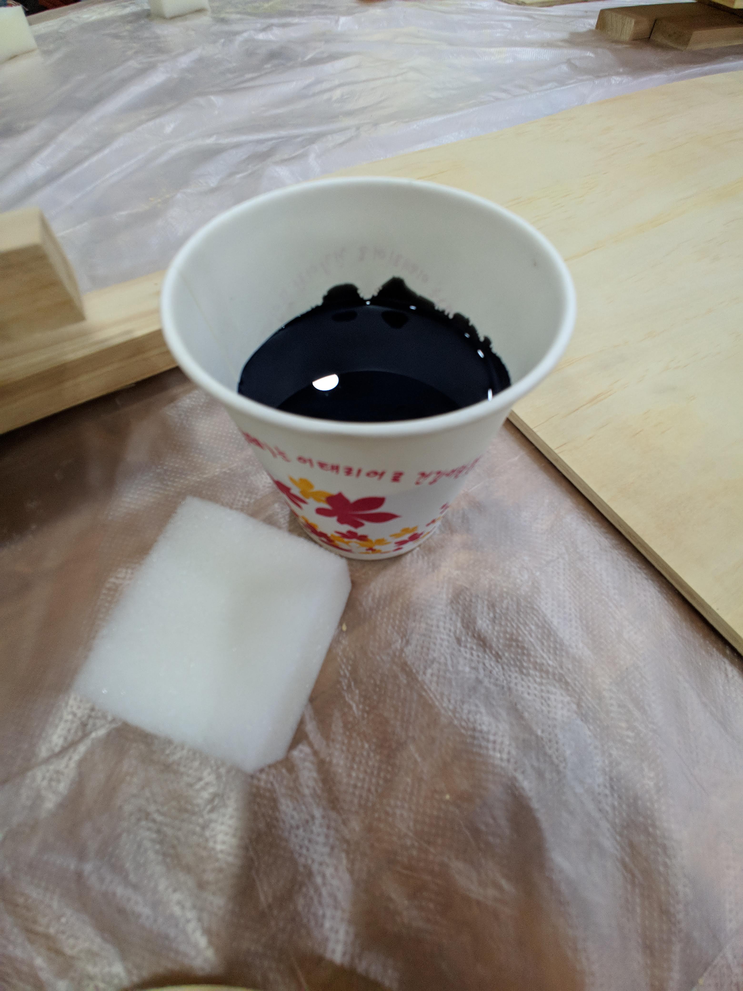 종이컵에 덜어 놓고, 스펀지로 살짝 찍어서 나무 결따라 색을 칠했습니다. 양은 조금 해서 여러번 바르는 거 아시죠?