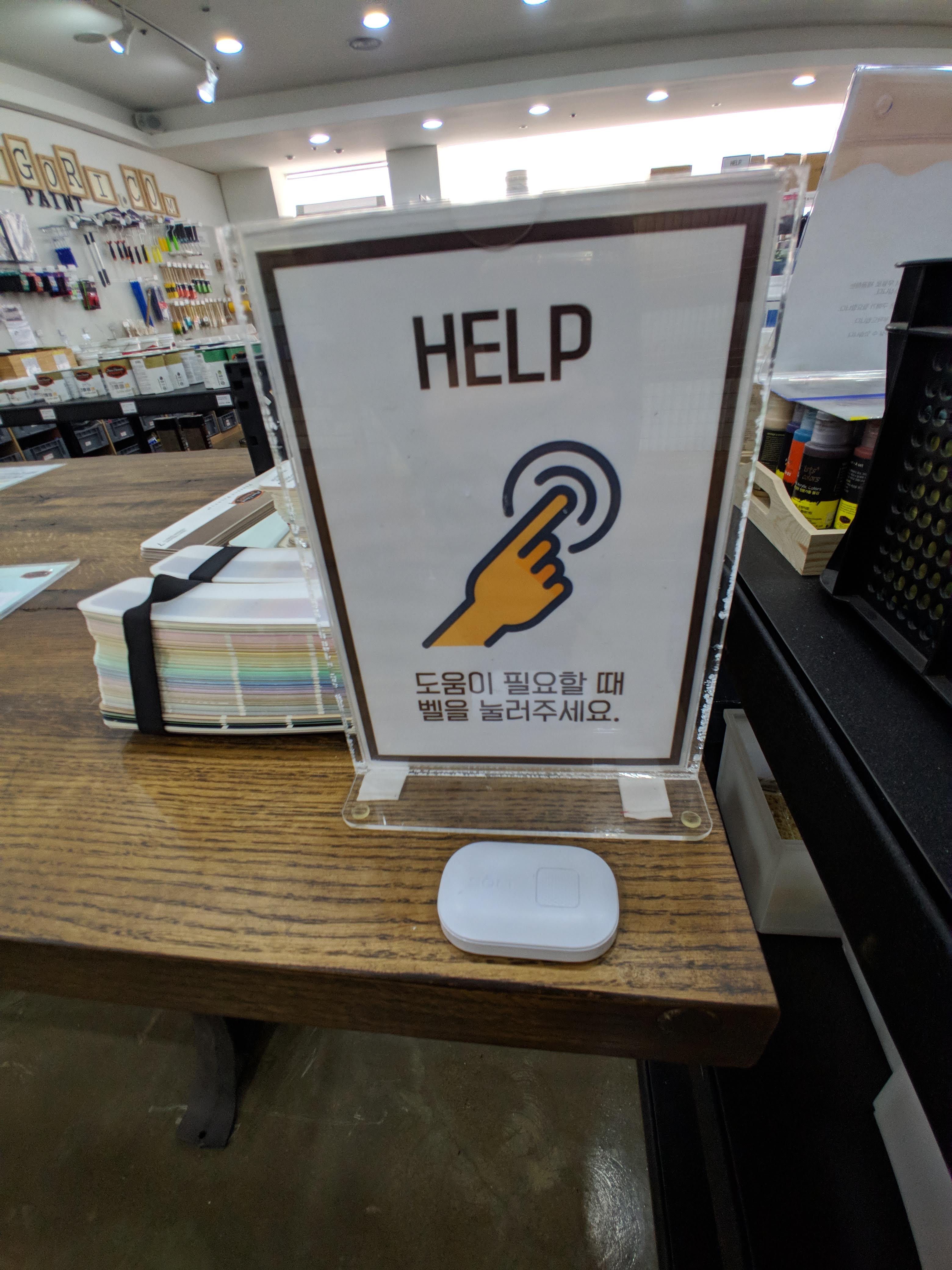 문고리 닷컴하면 셀프 페인트도 빠질 수 없는데, 매장 내 페인트가 비치되어 있는 곳에는 헬프 벨이 설치되어 있네요. 매장이 살짝 꺽인 "ㄴ"자 구조라 여기까지 점원들이 보지 못해서 그런것 같아요. 아무튼 여기 벨을 누르시면 오셔서 페인트에 대해서 설명해주시는 것 같았어요.