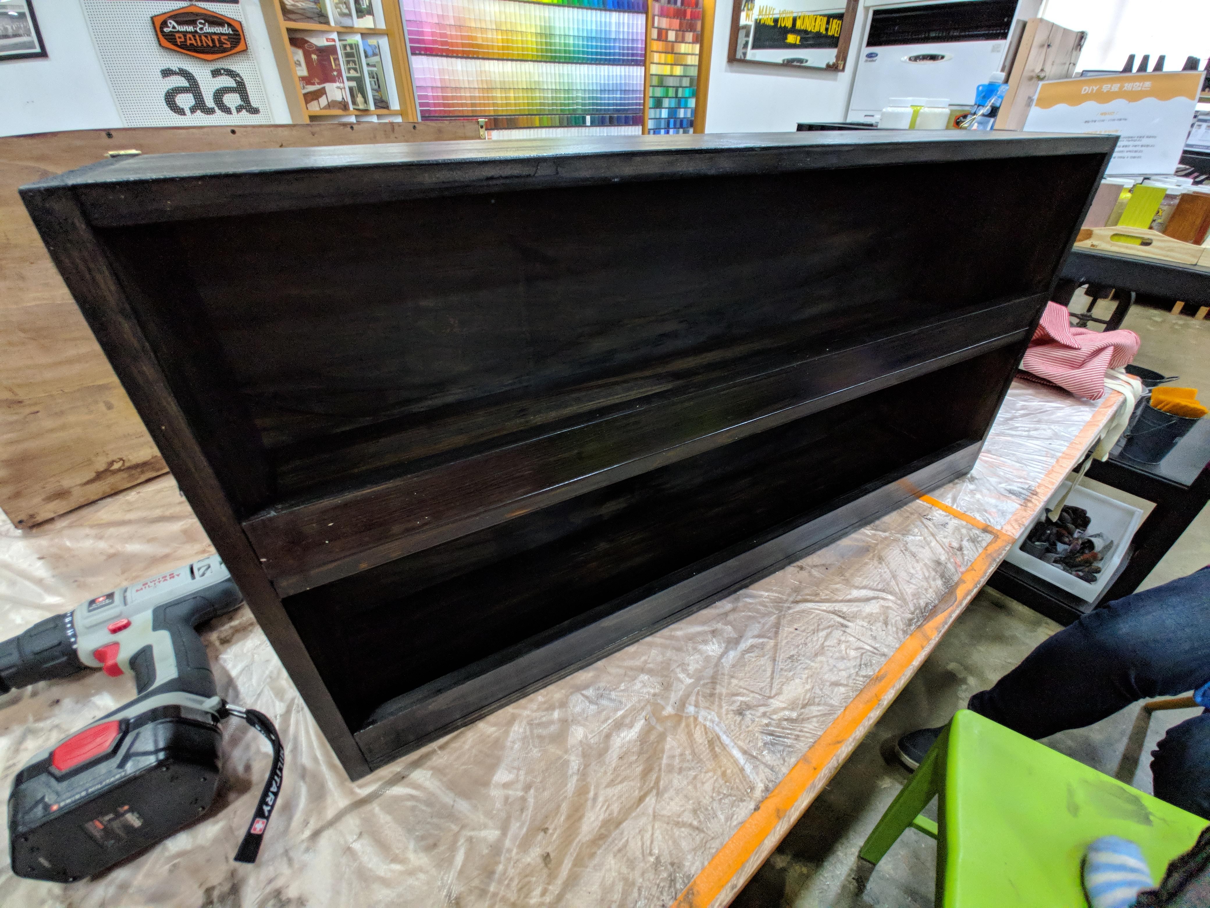 저희 아들이 고른 흑단색, 나중에 와이프가 왜 이런 컬러로 했냐고 집에 둘때가 없다고 하네요. 컬러 덕분에 부엌뒤 베란다에 비치되어 있네요. 다 아시겠지만 완성 후에 집에 어디에 둘지, 색이 조화를 이룰지도 생각해보시고 컬러 선택하세요. 어떤 분은 무색으로 투명한 색을 발라서 원래 나무 색을 살리는 분도 계셨어요. 그리고 그게 제일 쉬워보였어요