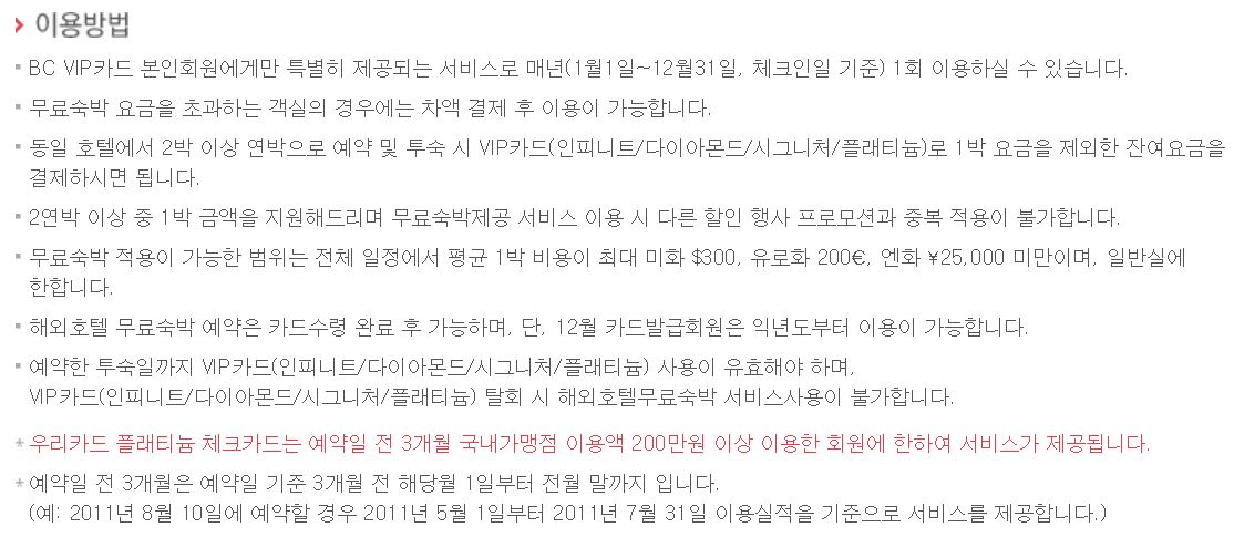 이번에는 이 혜택을 사용하지 못했는데요 사실 이것만 사용해도 연회비가 아깝지 않을 것 같습니다. 2박 이상 같은 숙소에 숙박지 1일 이용요금은 100% 지불하고 익일은 무료, 3일은 일부 금액 할인되는 혜택이었습니다. 아쉬운 점은 BC카드에서 운영하는 사이트(http://bctour.bccard.com/app/loung/tourHotelSubMain.do)에서 예약을 해야 하는데 일반적인 호텔 사이트 보다는 싸지 않다는 단점이 있습니다. 가격 비교 잘 해보셔서 어떤게 더 좋은지 보시고 활용하시면 연회비가 아깝지 않을 것 같습니다.
