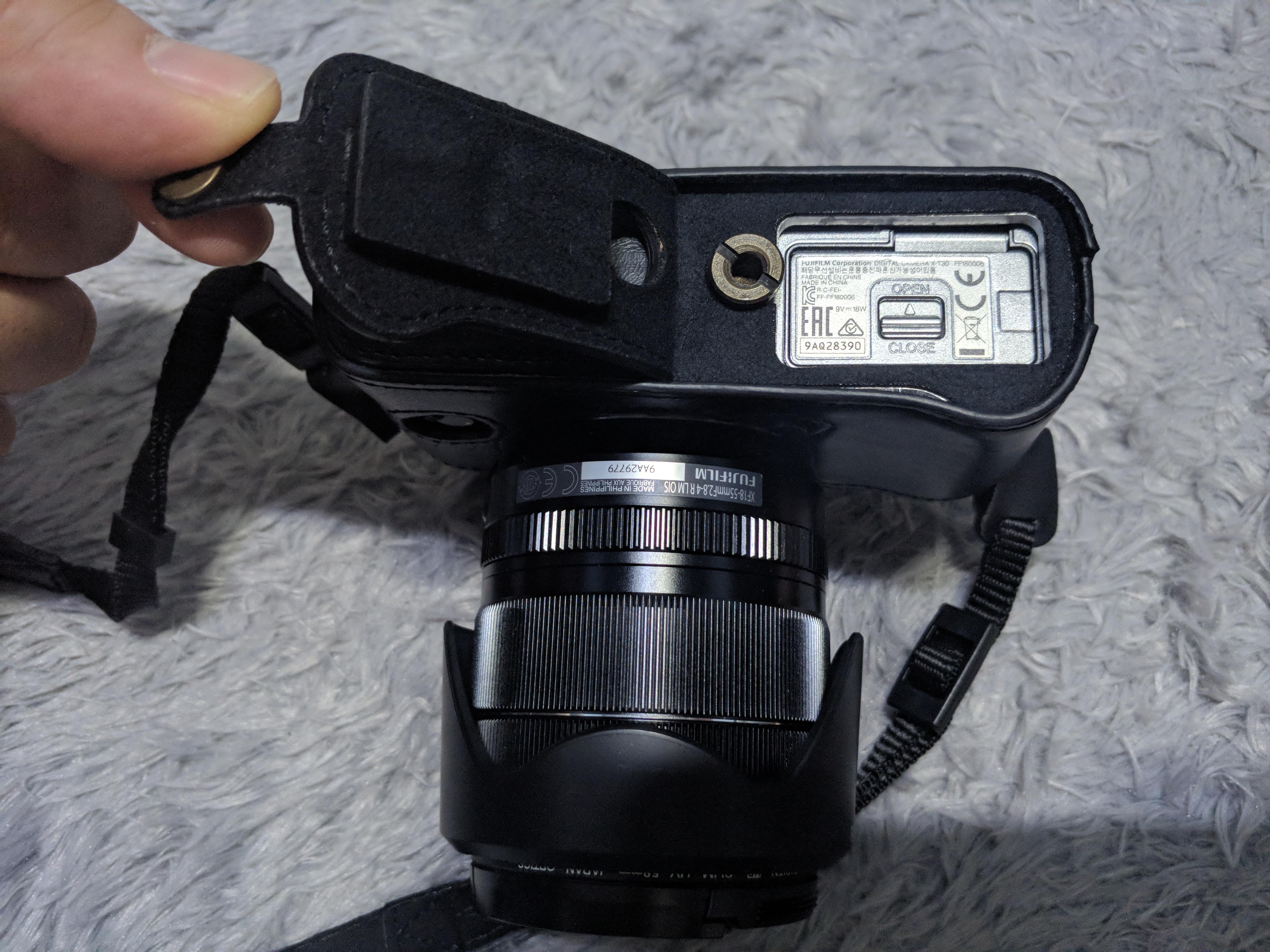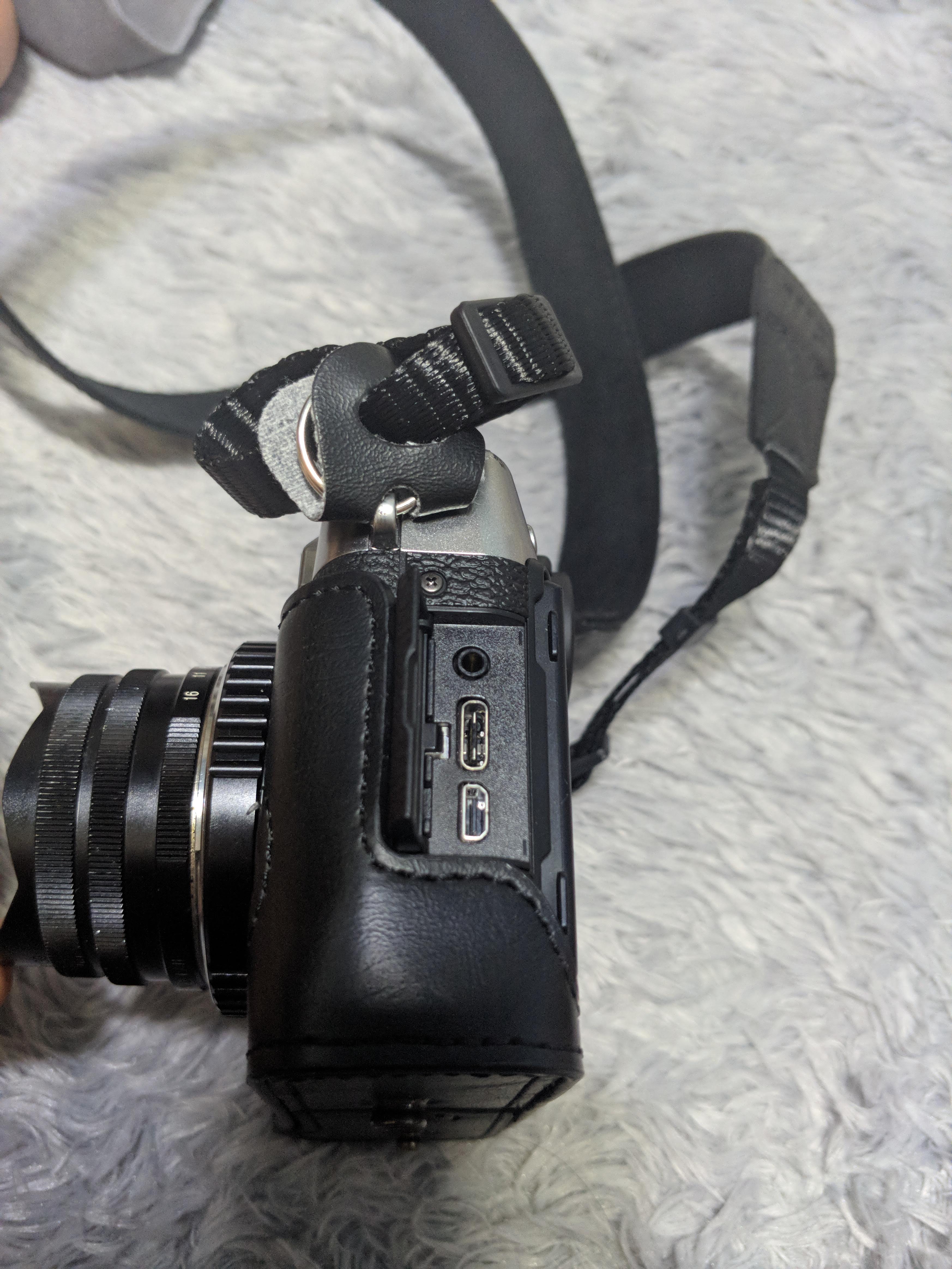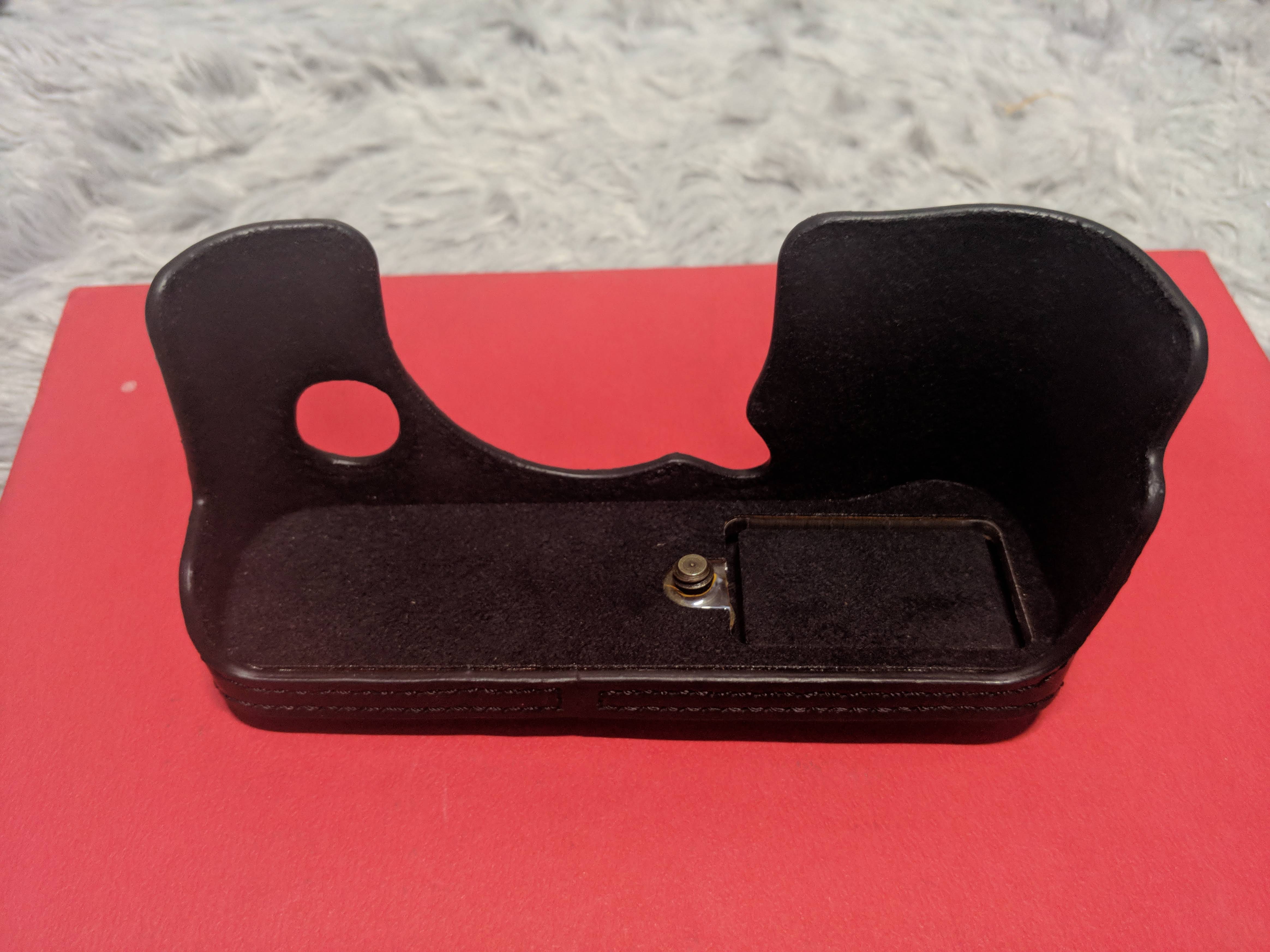 박스내 구성품 보면, 설명서(한글도 있음), 스트랩, 케이스가 들어 있었어요. 케이스는 아마존에서 본 이미지 보다는 상태가 괜찮아 보였어요. 카메라와 스트랩을 연결시키는 링은 사이즈가 바디의 구멍보다 커서 장착은 되는데, 움직이지 않네요. 조금 불안하게 설치가 됐어요.