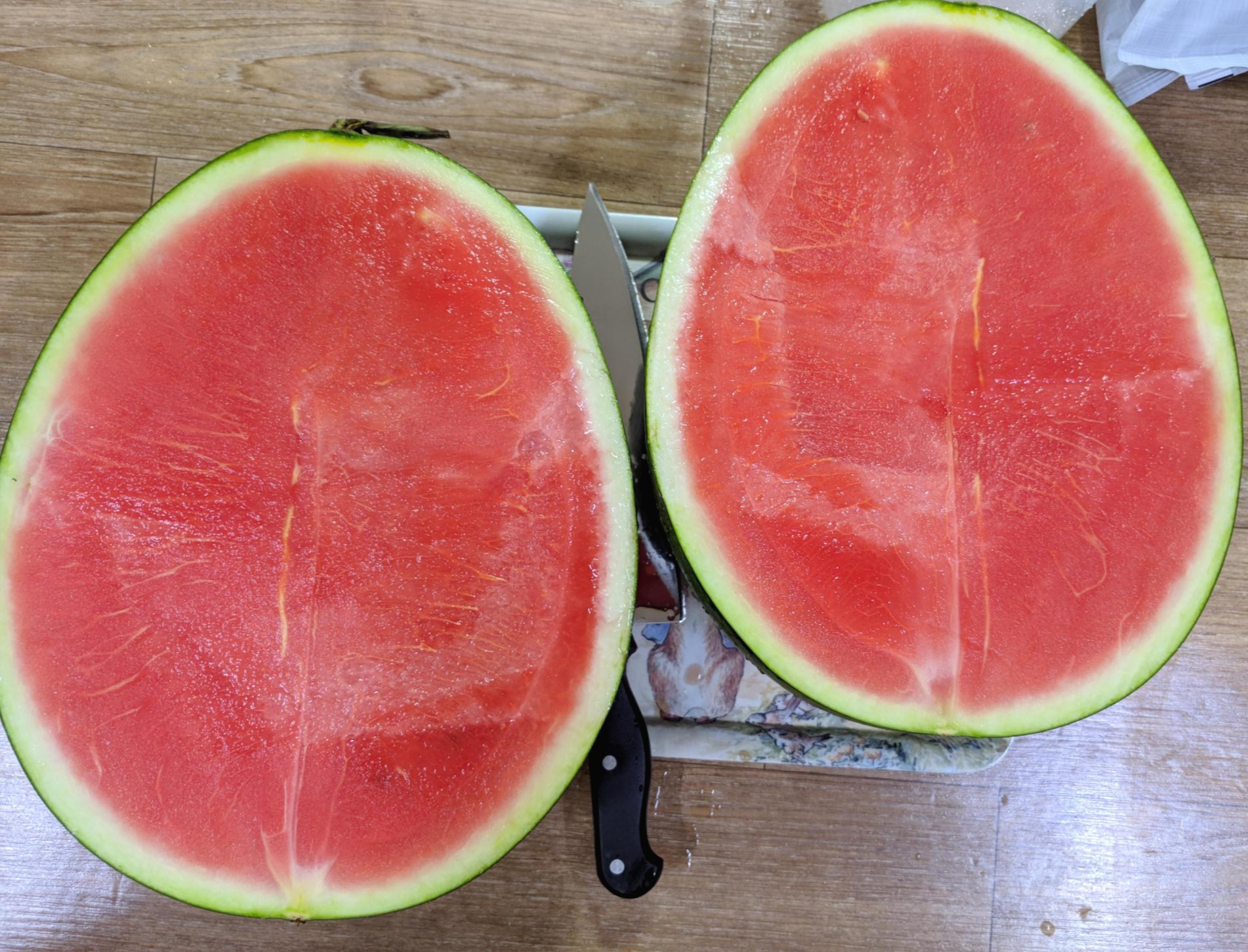 가뜩이나 노브랜드에서 산게 맘에 안 들어하는 와이프인데, 노란 줄 같은 게 많아서 신경 쓰였는데 냄새도 안 나고 먹어도 크게 문제없는 것 같아서 그냥 다 잘랐습니다. ㅋ 그래도 노브랜드 수박은 다시는 안 살 것 같네요.