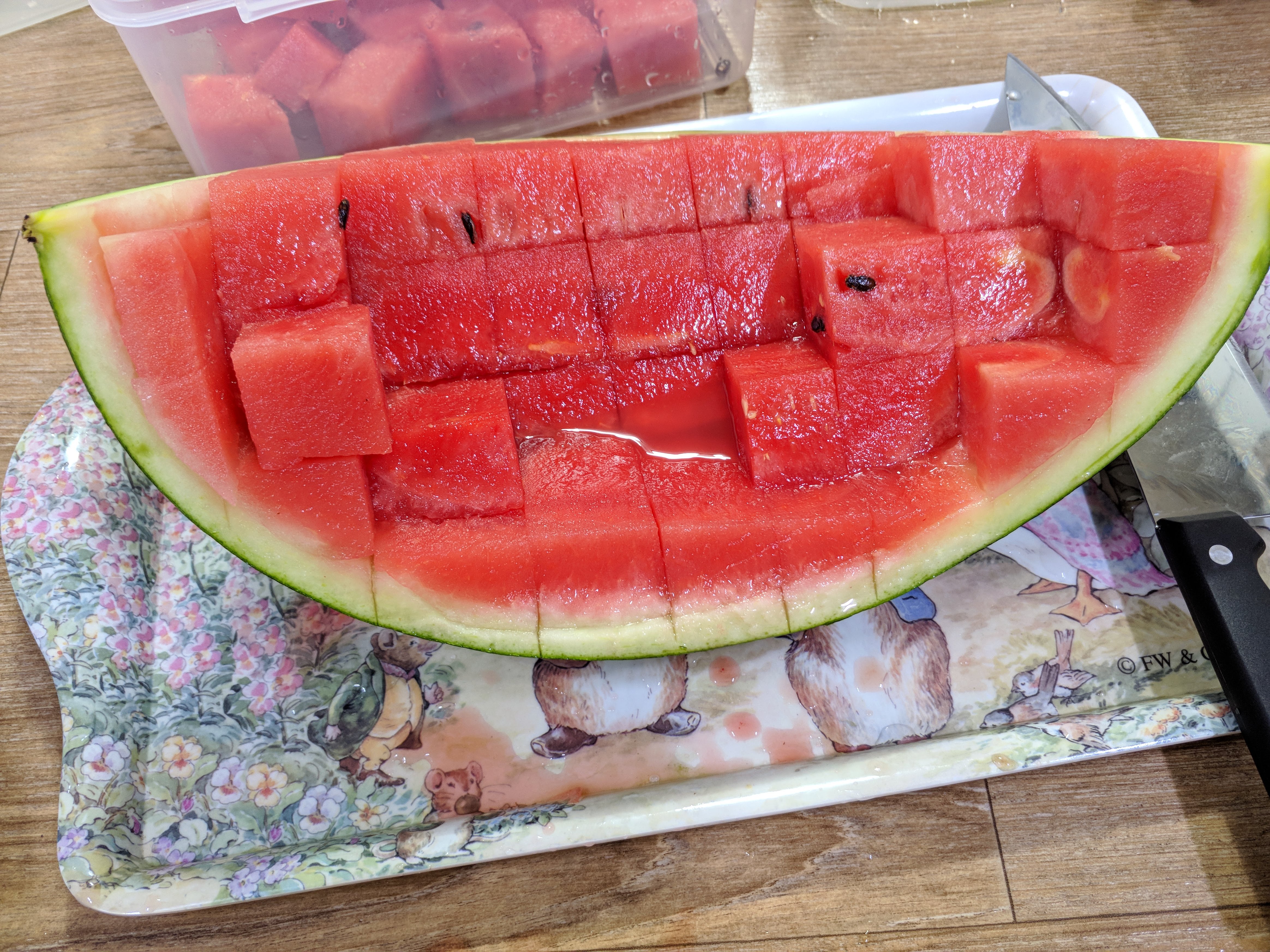 5. 준비한 통에다 수박 큐빅을 넣어 줍니다.