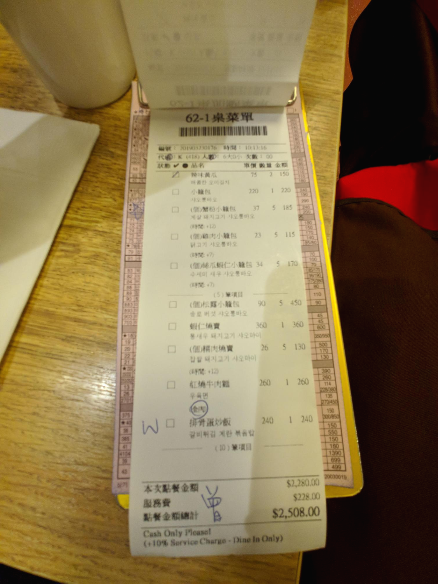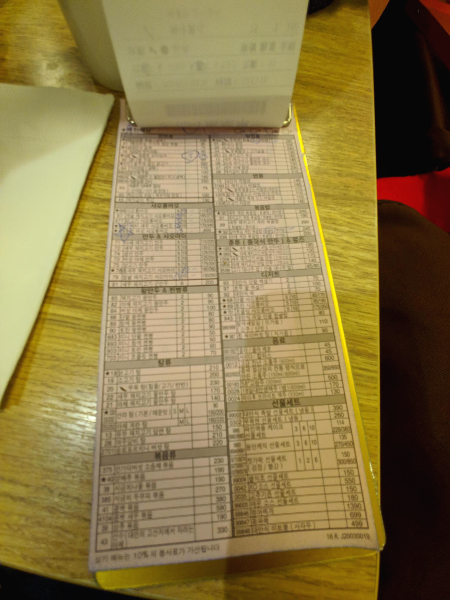 주문한 요리가 하나씩 나오면 계산서 같은 거에 표시를 해주셨어요.