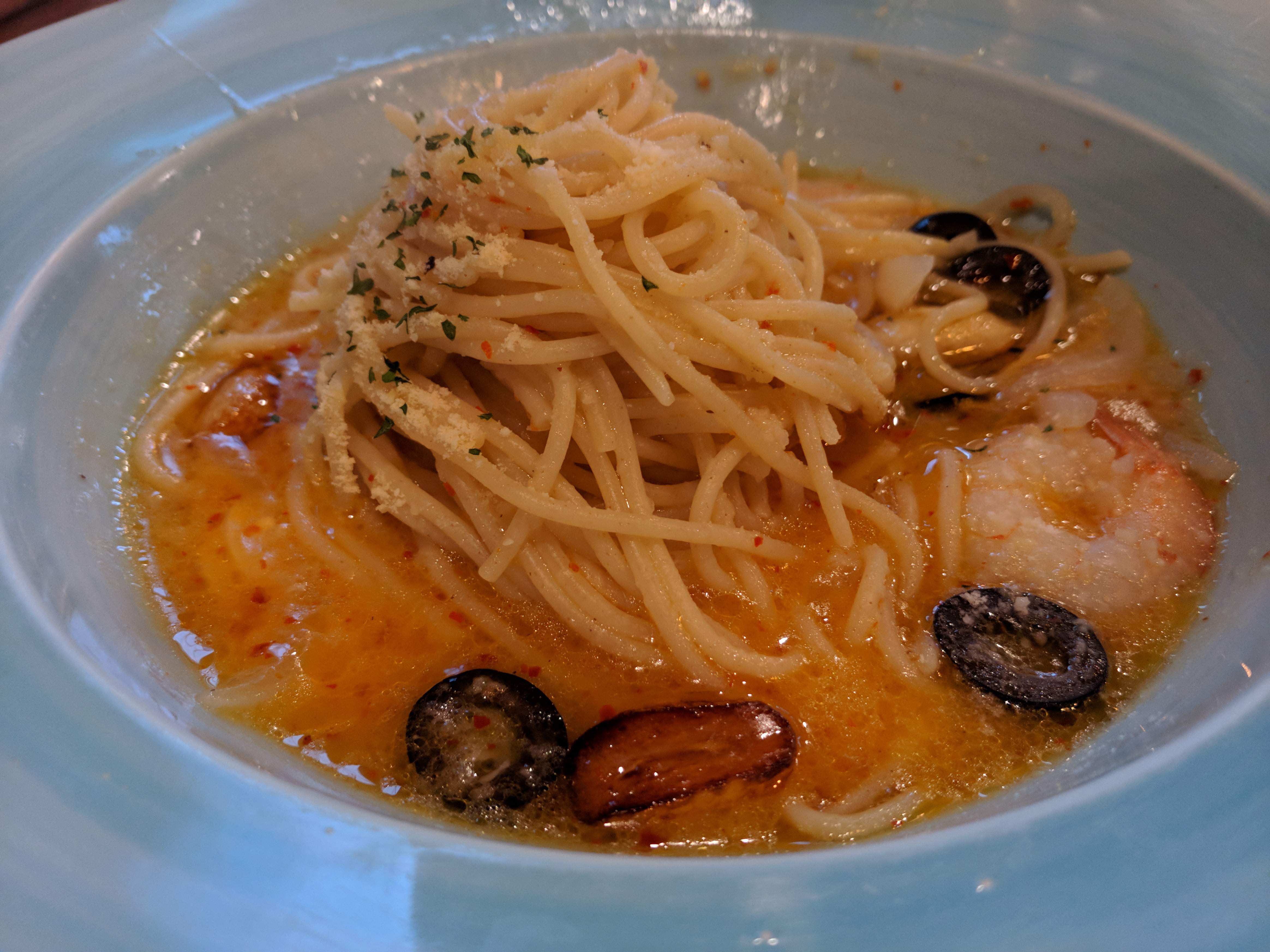 보통 느끼하면서 담백한 알리올리오와는 다르게 약간 매운맛을 추가해서 느끼한 맛을 싹 잡아줍니다. 당연히 어린애들이 먹기엔 맵고 어른들이 먹기에도 살짝 매운 느낌입니다. 확실히 다른 데서 먹어보기는 힘든 맛이죠!