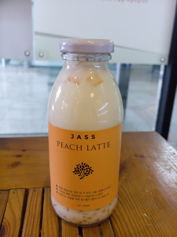 왼쪽에 있는 병들이 딸기 라테고, 그 오른쪽이 밀크티(원액에 우유를 타서 주십니다.) 그 옆에 캠벨쥬스 그리고 대망의 복숭아 라떼가 나오고 있습니다. :)