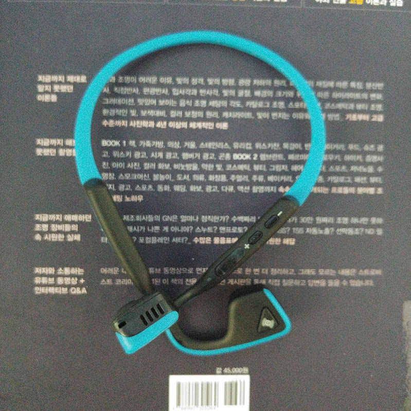 어느날 아침 힘겹게 침대와 일체된 몸을 어렵사리 분리 시켜서 출근 준비를 하는데, 저희 아들은 오늘도 저보다 먼저 일어나 있네요. 그리고 머리에 뭔가를 쓰고는 마이크처럼 사용하고 있는데, 제 골전도 이어폰이었어요.
