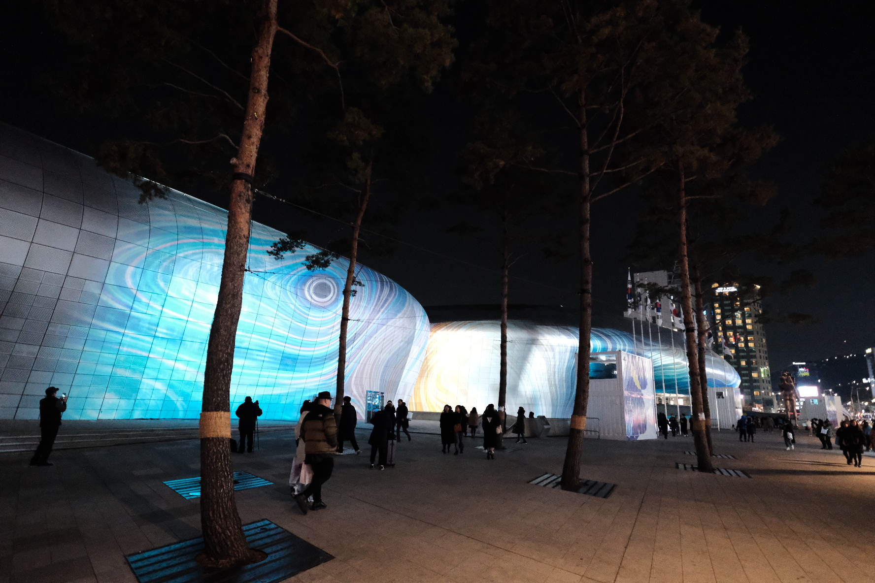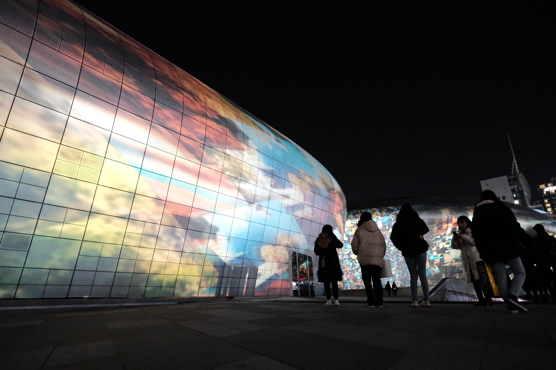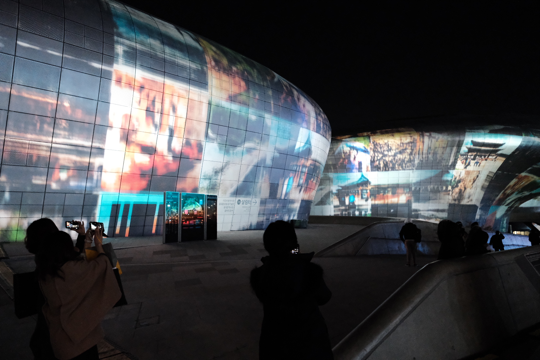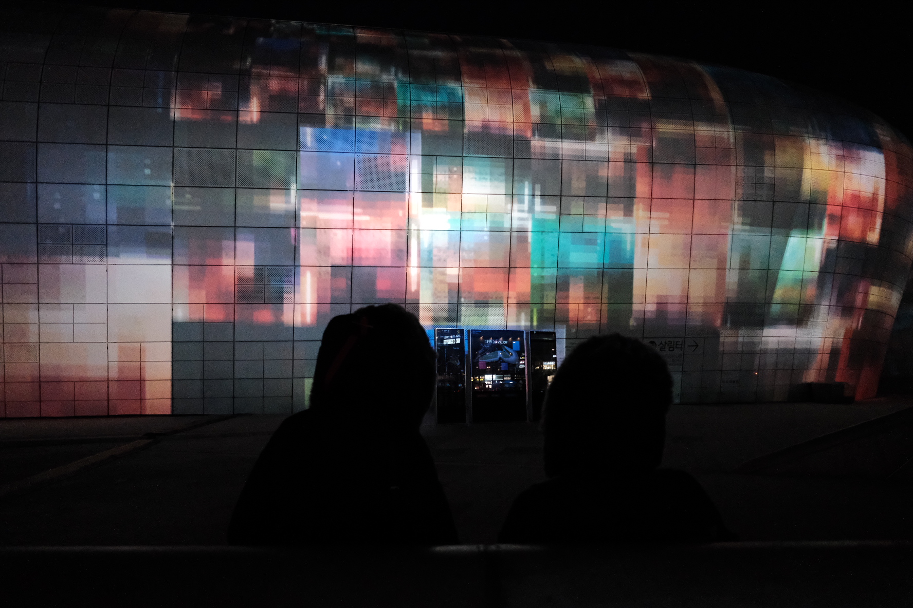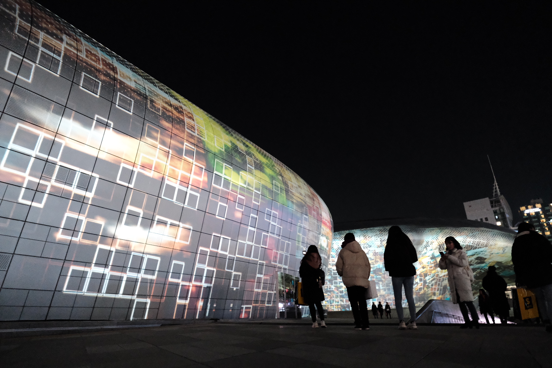 영상이 시작되기 전엔 몰랐는데 DDP앞에 2층으로 세워진 컨테이너 건물들이 있었는데, 그 컨테이너에서 빛이 나오고 있었어요. 그리고 음악은 주변 높은 건물들 때문에 살짝 울림이 생겨서 웅장한 느낌도 들었어요.