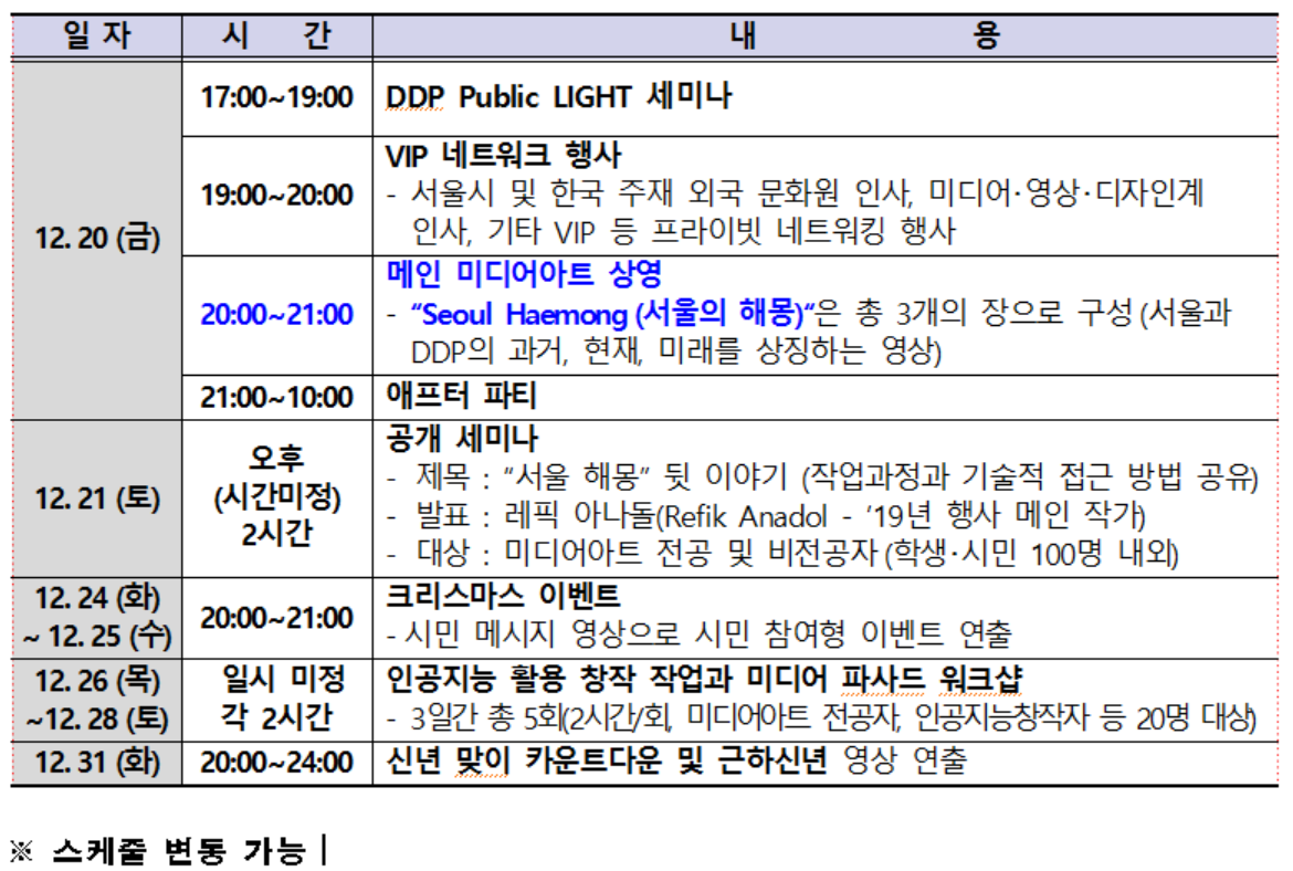 | ■ DDP 야외 공연 및 행사 ○ 서울라이트 겨울빛콘서트 (어울림광장) – 12월 20일 18-20시 : 써드아이, 느와르, 버스터즈, 희나피아, DJ Koo (MC 김재욱) – 12월 21일 18-19시 : 해시태그, 퍼플백 등 (MC 쥰키) – 12월 24일 18-20시 : 헤이걸스, 초영밴드, Surl, 노브레인 등 (MC 쥰키) ○ 버스킹 (팔거리, 푸드트럭 운영일에는 DDP 북문) : 매일 17시-17시40분, 18시-18시40분 ○ 패션쇼 (행사장 일대) : 12월 20일 20시20분, 21시20분 ○ 비보이 공연 (카페 드 페소니아) : 12월 23일 20시30분-20시50분 ○ 서울라이트마켓 : 매일 16-22시 ○ 동대문상권마켓 : 12월 20~31일 12-22시 ○ 푸드트럭 (DDP 북문) : 행사기간 중 휴일·공휴일(12월 20-21, 24-25, 28, 31일 17-21시) ○ 서울라이트 포럼 : 12월 20일 13-17시 ☞사전신청 ○ 서울라이트 워크숍 : 12월 21-22일 10-17시 ☞사전신청(21일) ☞사전신청(22일) |