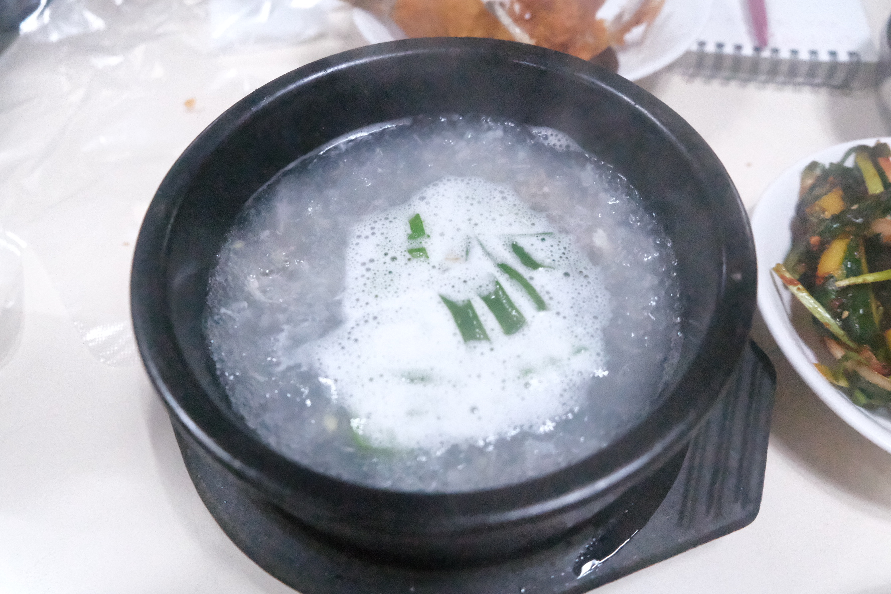 다른 블로그에서 삼계탕 국물이라고 하던데 삼계탕 국물 비슷한데, 연한 삼계탕에 파 향이 많이 났어요.