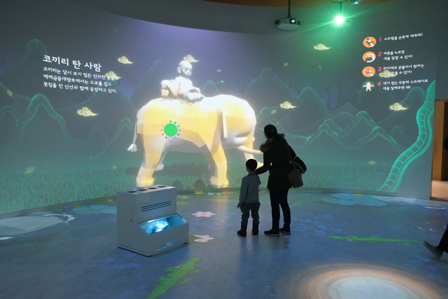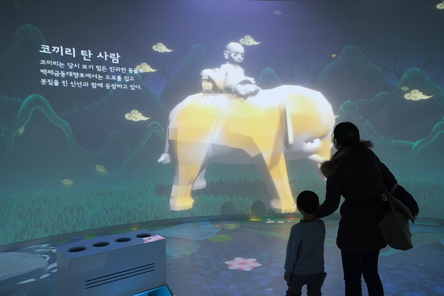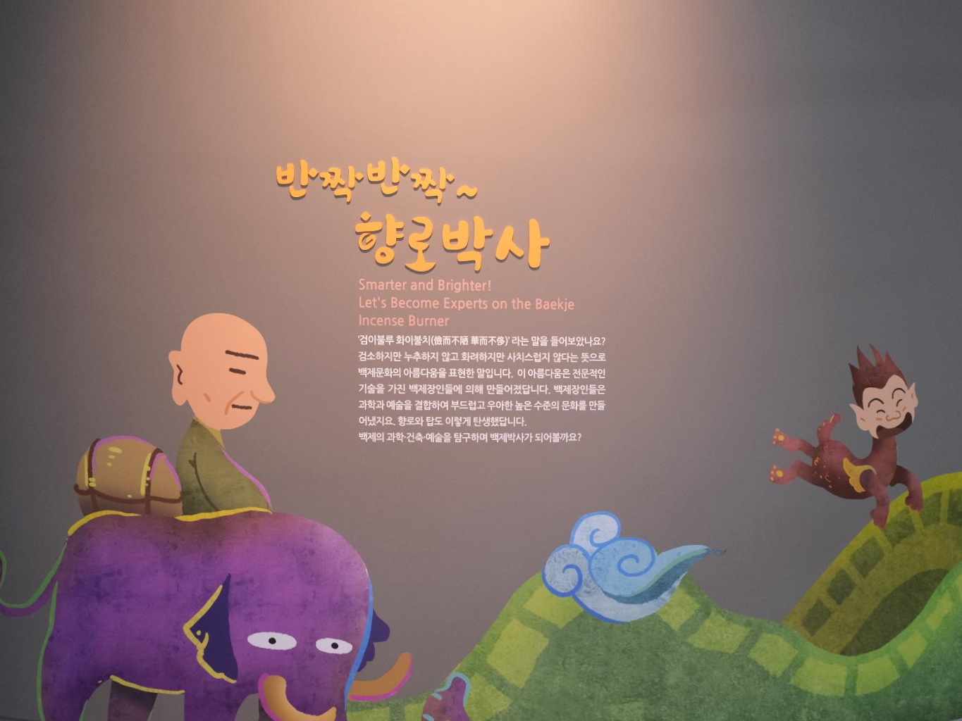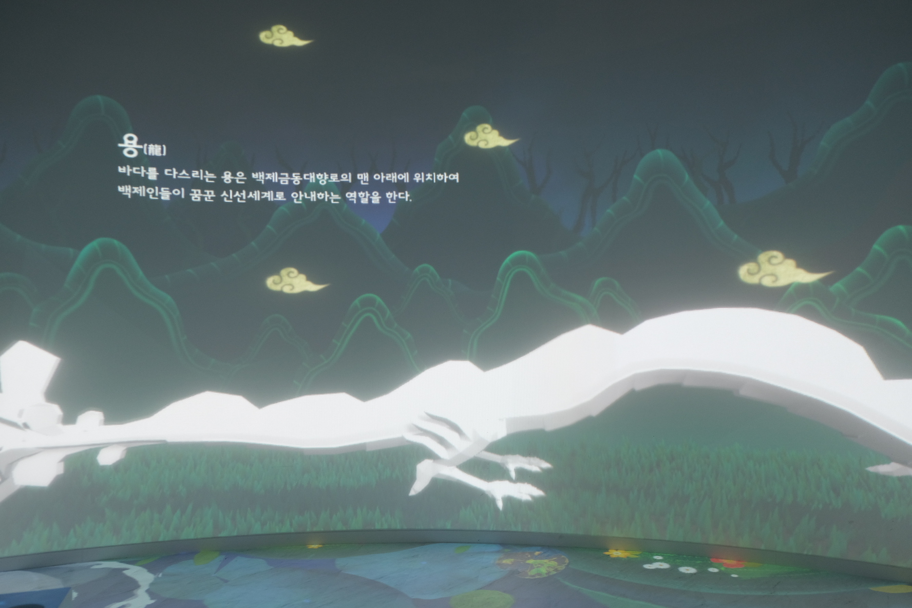 무슨 말이냐면, 방에 들어가면, 금동 대향로에 나오는 동물이 벽에 움직이며 등장합니다.