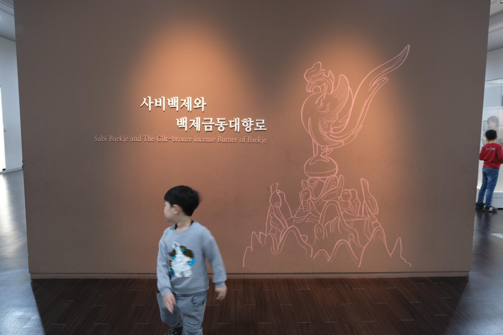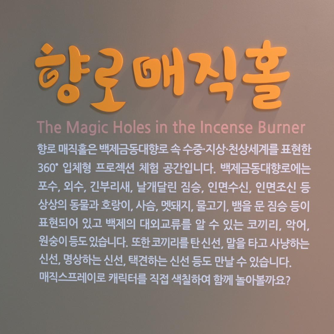 들어갈때까지만해도 몰랐는데, 빨간 기둥 위에 있는 검은색 그림자들은 다 금동 대향로에 나오는 동물들이었어요!!!