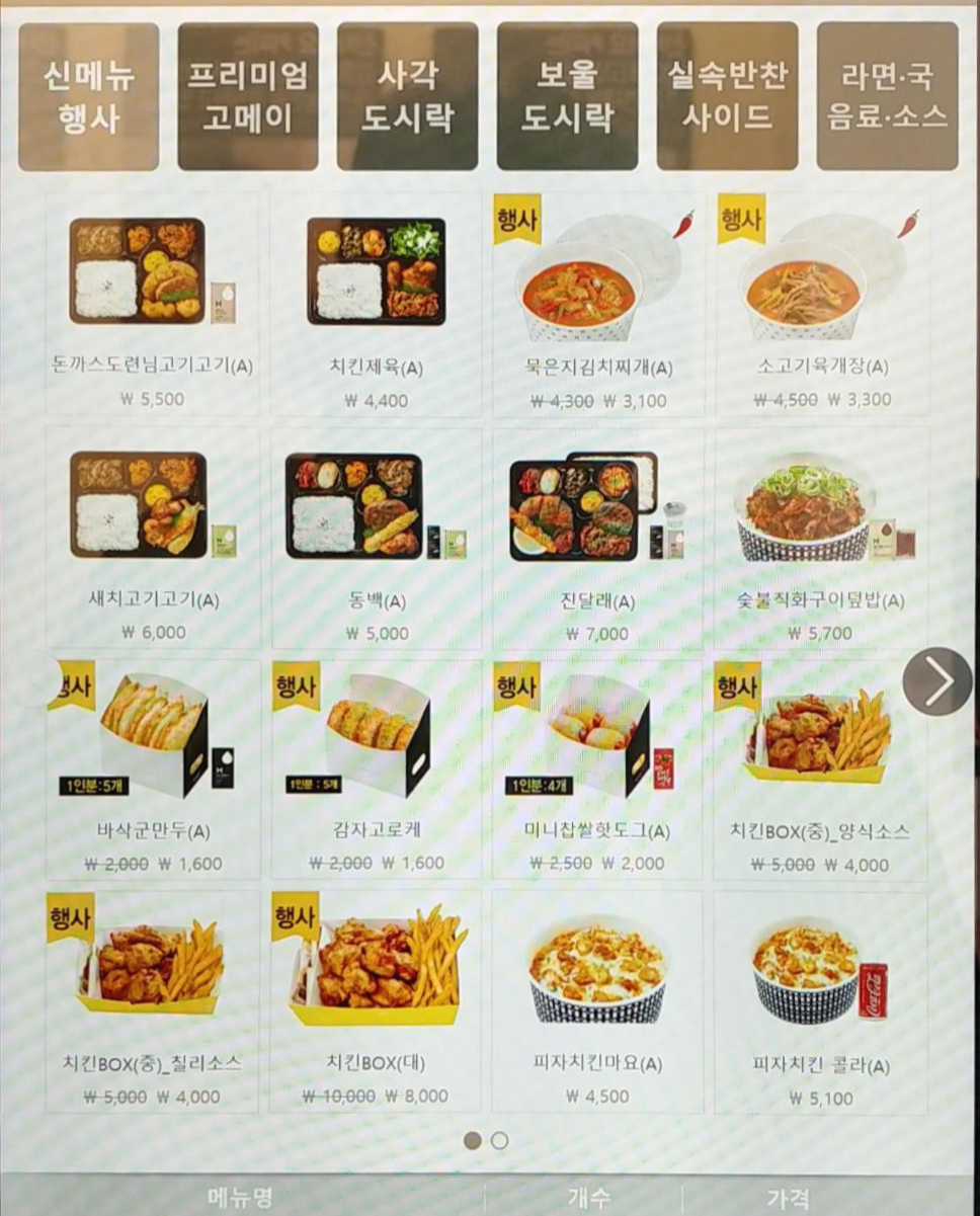 왼쪽부터 보면 도시락과 함께 먹을 수 있는 컵라면, 그리고 가운데는 음료수와 기본 밑반찬들이 보이네요.