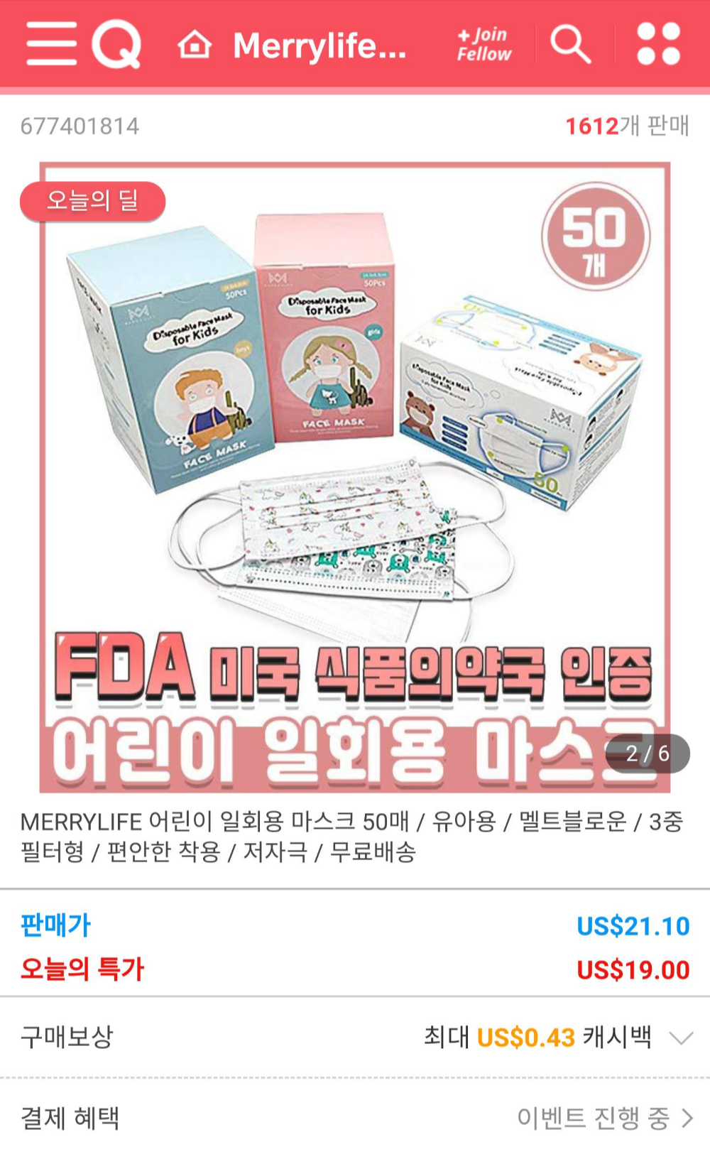 그러다 큐텐에서 어린이 마스크가 딜에 떠 있길래 구입했습니다. 지금 검색해보니 $1더 저렴한 쿠폰적용가 $18 판매하고 있네요 ㅎ 50장이니 한장에 440원 정도 되겠네요