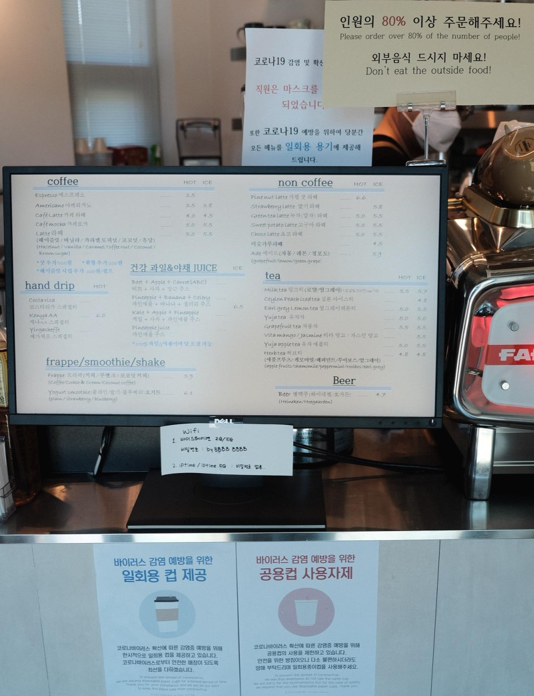 물은 셀프인데, 코로나 때문인지 종이컵을 비치해 두셨어요.