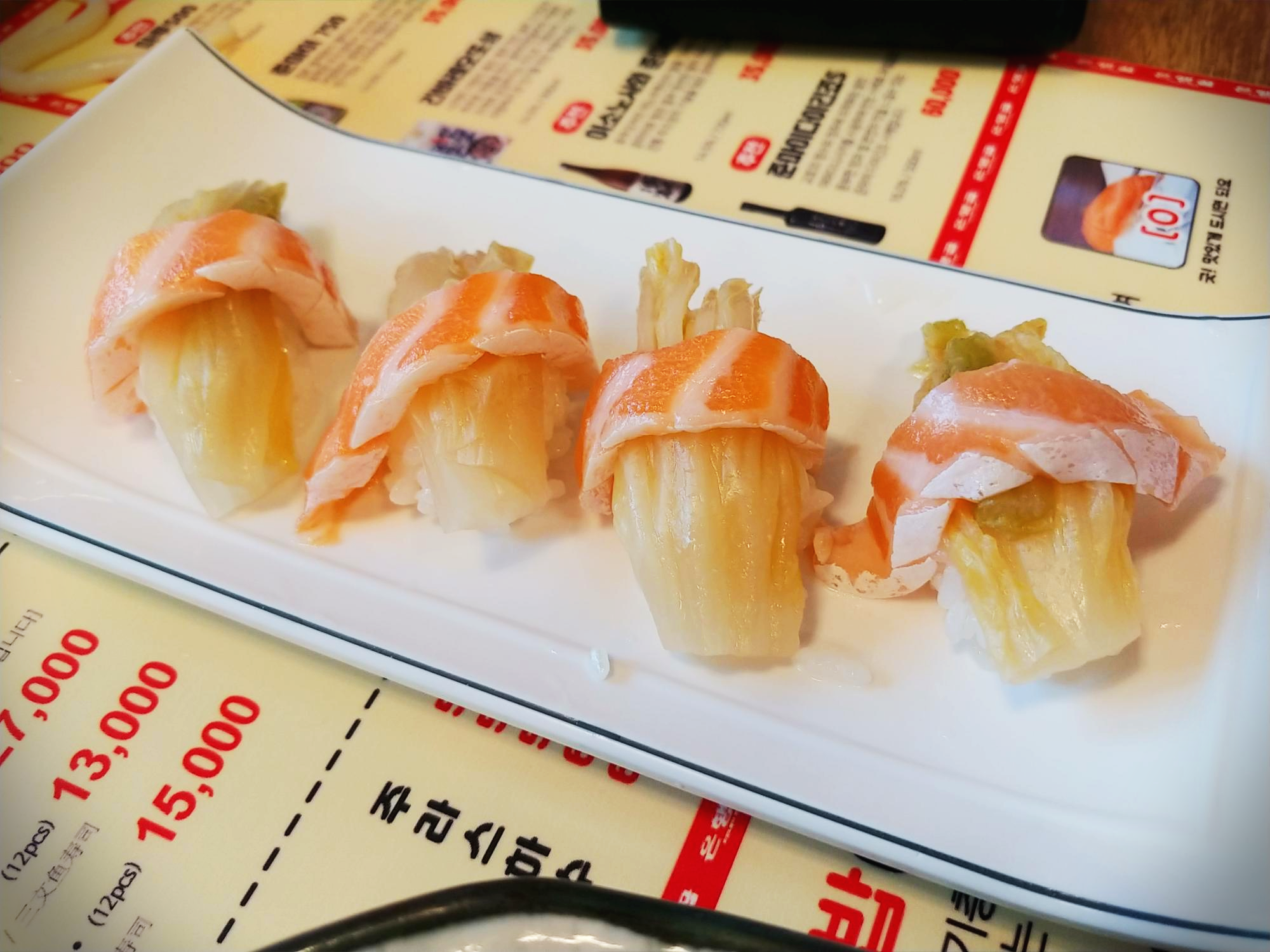 그리고 끝으로 서비스라고 하시면서 묵은지 초밥 같은 걸 주셨어요 ㅎ 1인당 한개씩!
