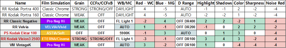 아래 이미지 왼쪽 첫번째행에 있는 것이 각 필름의 이름이고, 오른편에 각각 설정 값들이 주어져 있어요. 카메라 메뉴에 들어가서 "이미지 품질 설정"에 있는 값들을 설정해줄수 있는데 어렵지 않아요.