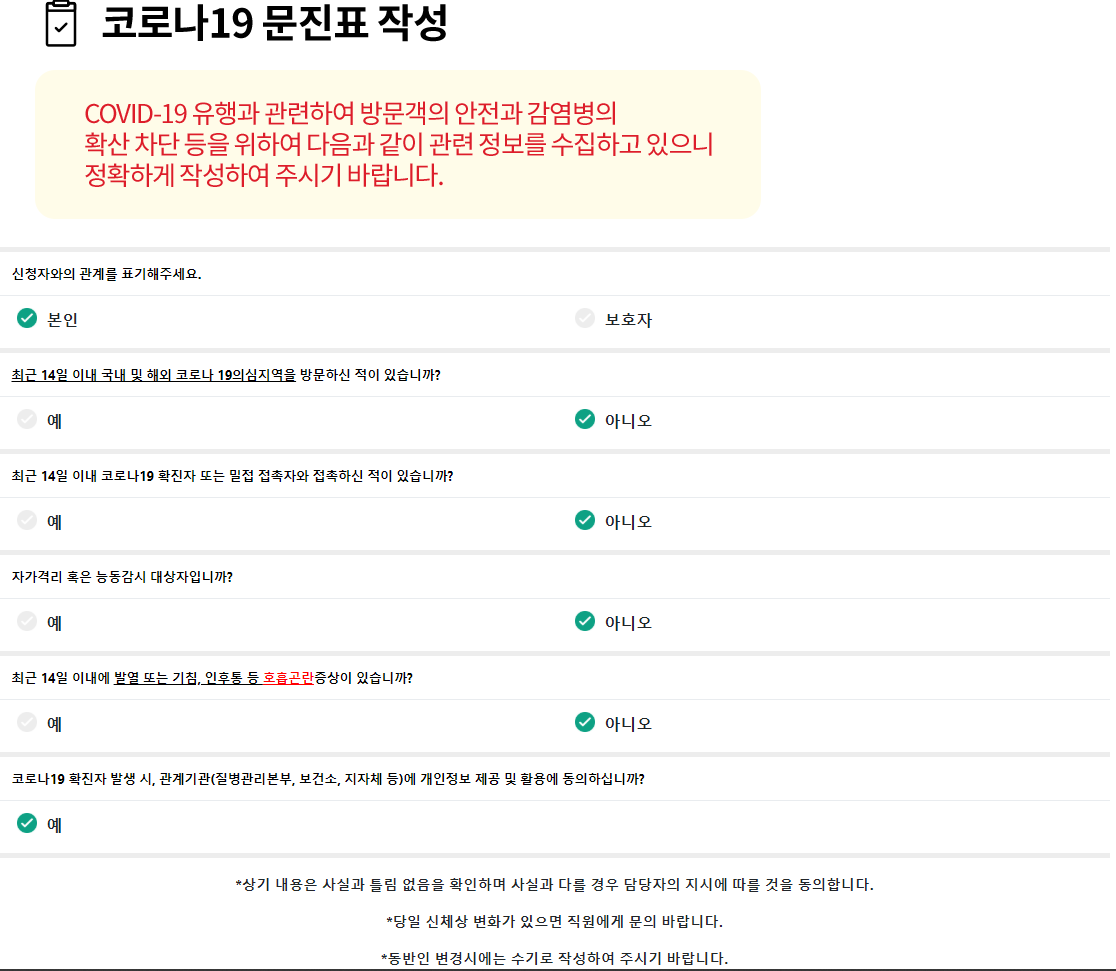 동반인 정보까지 입력을 마치시면, 문진표를 작성하게 됩니다.