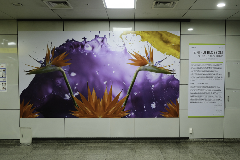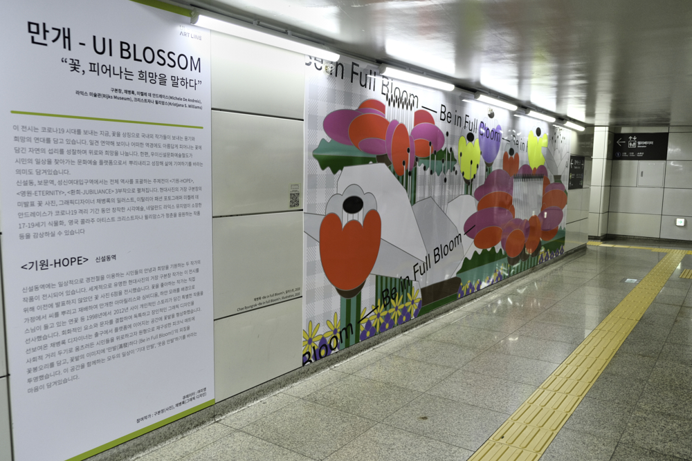 지금 진행 중인 전시는 UI blossom 만개라는 전시인데, 시민들의 삶에 웃음이 만개하기를 기원하는 전시라고 하네요. 아무래도 모두가 코로나 때문에 많이 지치고 했던 터라, 조그만 위로를 전해주고 싶었나봐요.