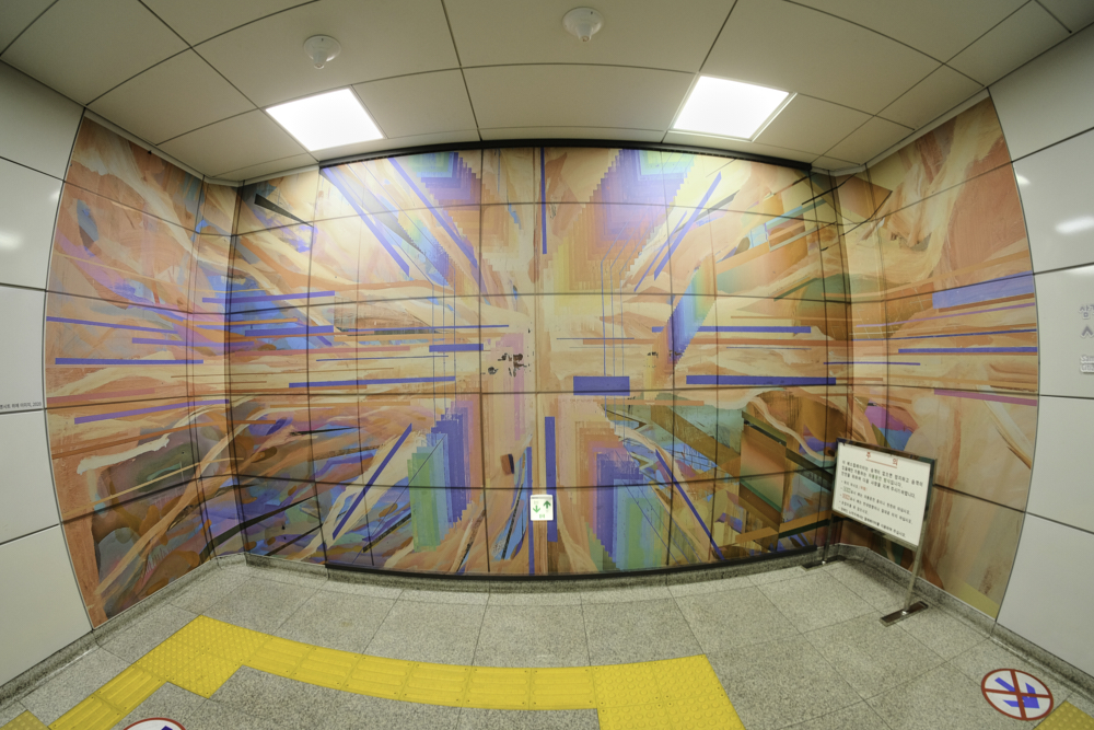 먼저 프레임 안에 있는 작품이 보이고, 그 아래로 내려가면 벽면 전체에 작품의 캔버스가 확장되고, 거울등을 통해 관람객이 작품의 일부분이 되는 작품이었어요. 아무래도 지하철이다 보니, 지하철 노선이 얽히고 섥힌 모습을 표현 한것 같아보였어요.