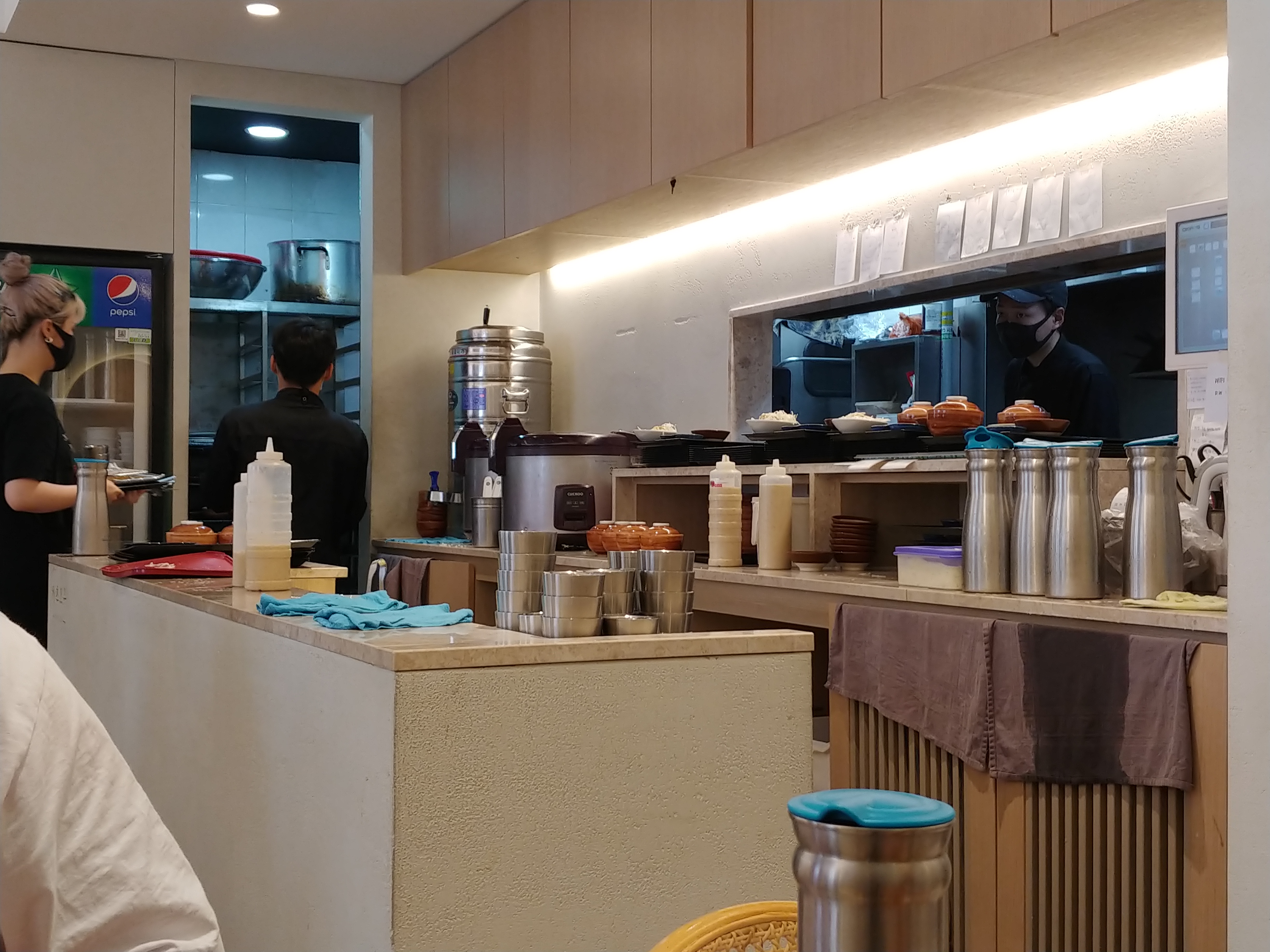 아래 사진 왼쪽 아래 행주(?) 같은 것에 물이 젖어 있어서 바닥에 물이 떨어져서 바닥이 미끄러운데 아무도 닦을 생각을 안하시더라구요.