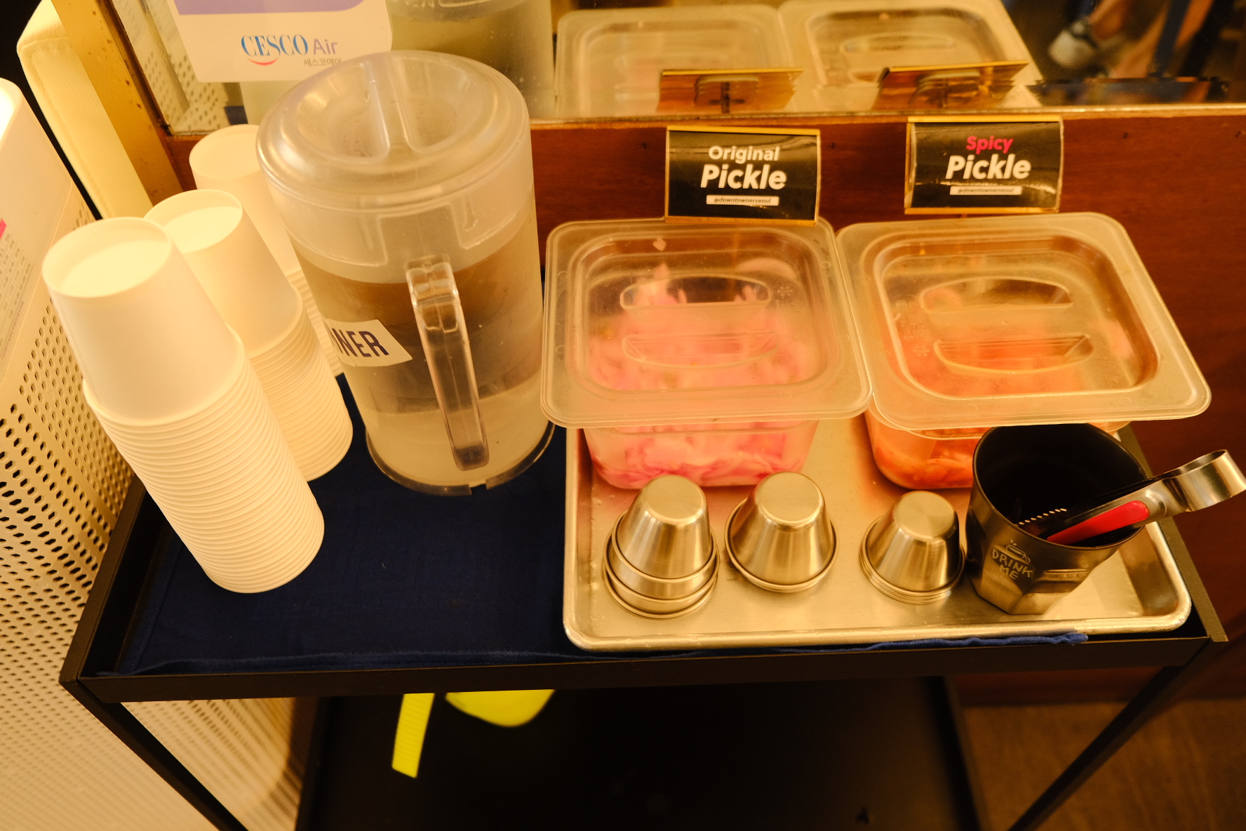 카운터 옆에 냅킨이 준비되어 있었고, 반대쪽 벽면에 물과 피클들이 준비되어 있었어요.