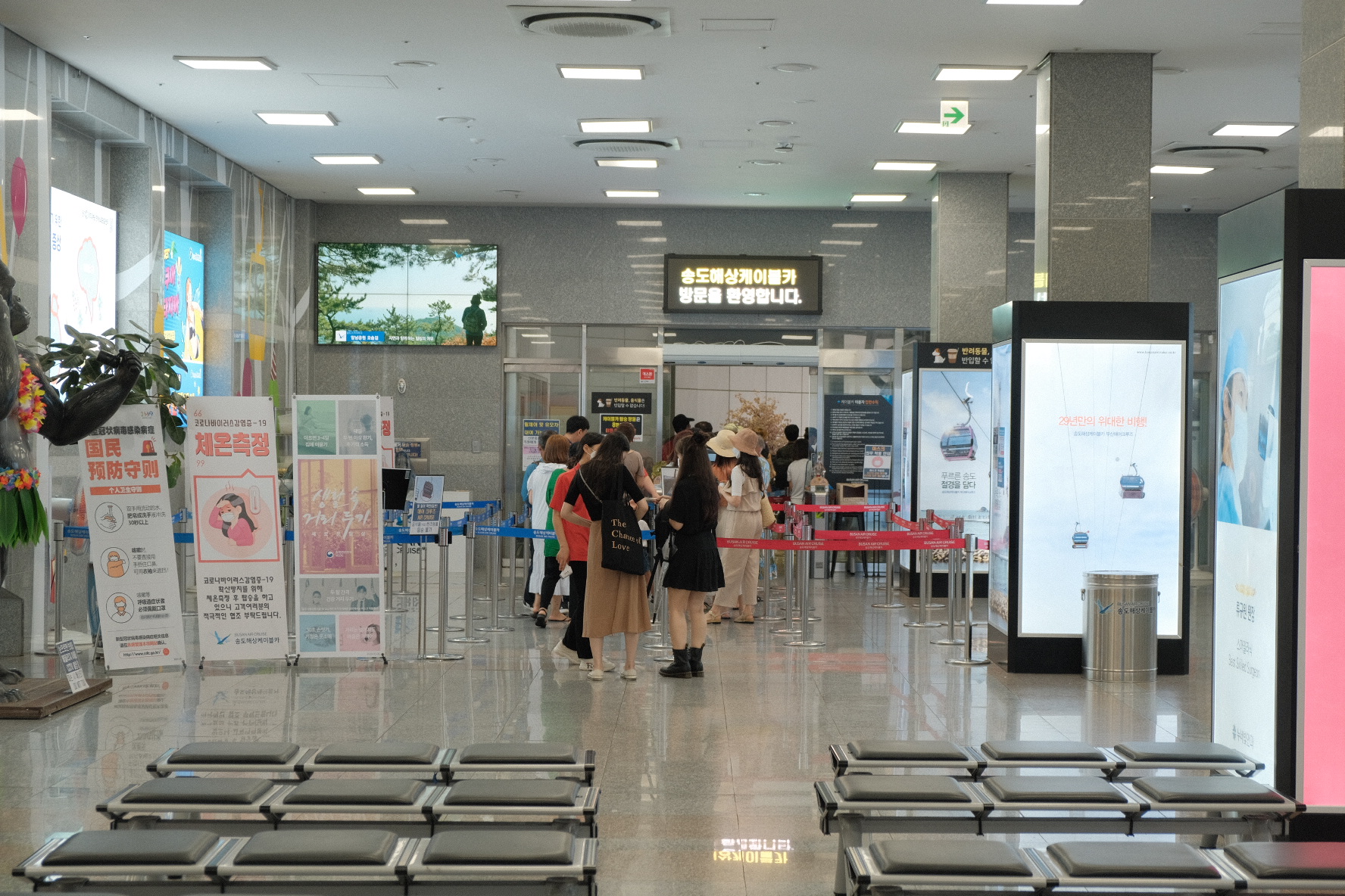 탑승 전에 체온 측정하고 손에 손 세정제를 뿌려주시면 줄을 서고 기다리게 되었습니다.