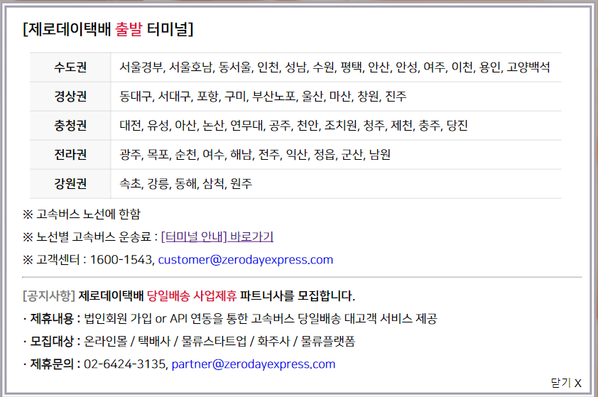 택배 발송은 아무곳에서나 되는건 아니고, 아래 리스트에 있는 터미널에서마 발송할 수 있다고 하네요.