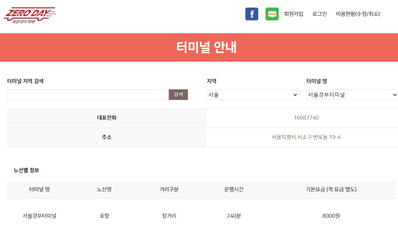 요금 및 발송 수송 가능한 터미널은 홈페이지에서 확인 가능했습니다.