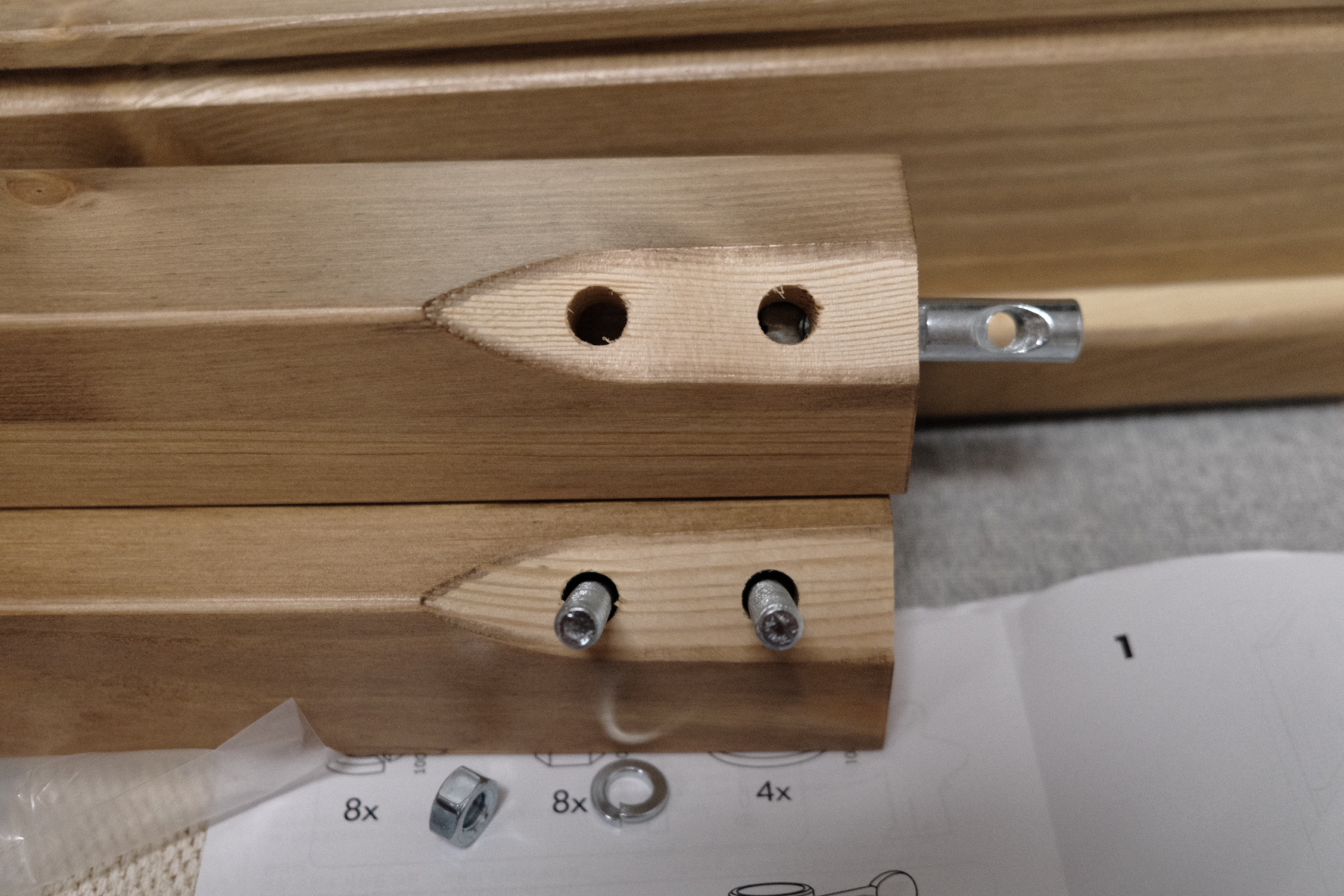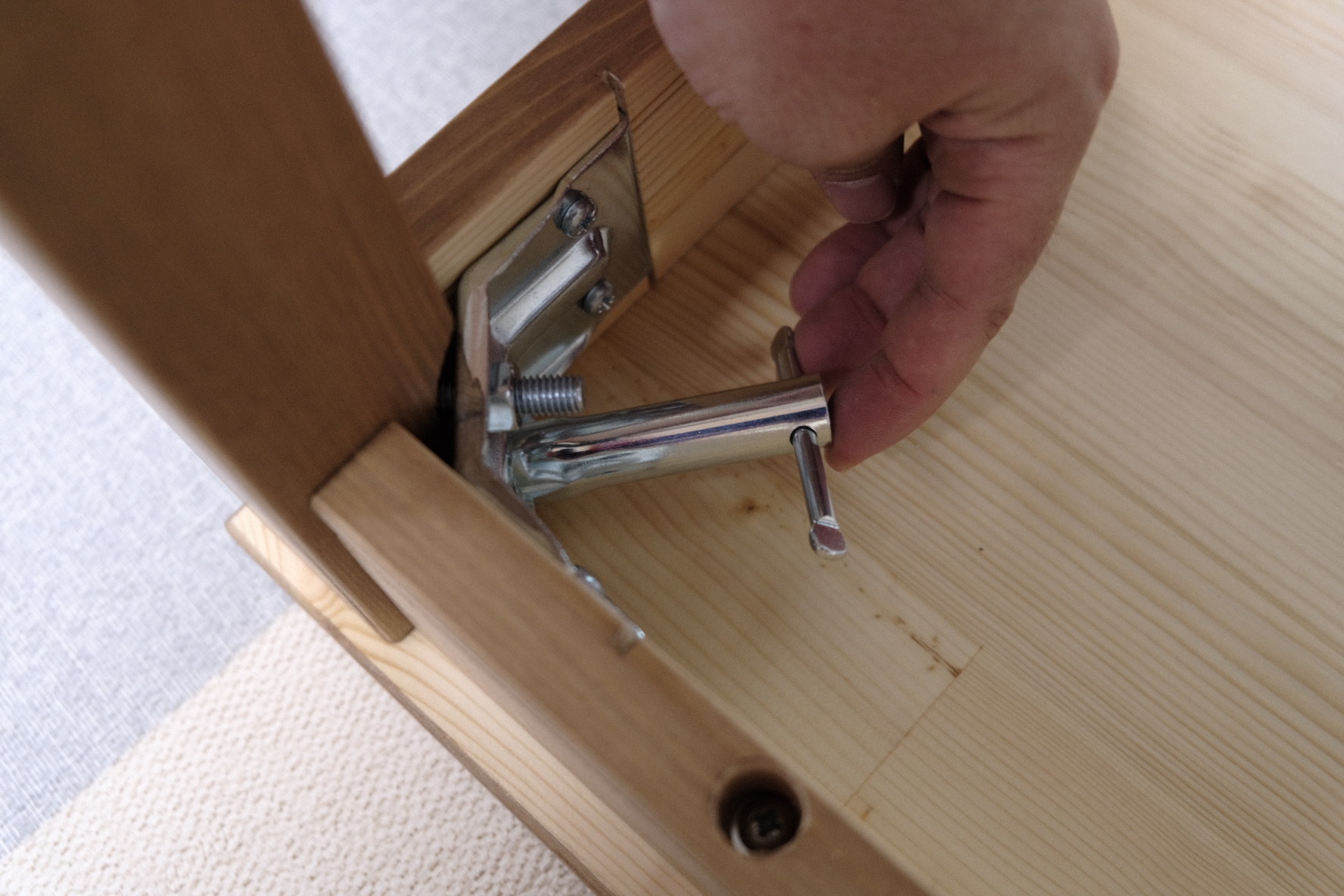 구멍이 두 개 난 새끼손가락 만한 것을 다리에 넣고 구멍에 맞춰서 스크루 나사를 꽂아 주면 됐어요.