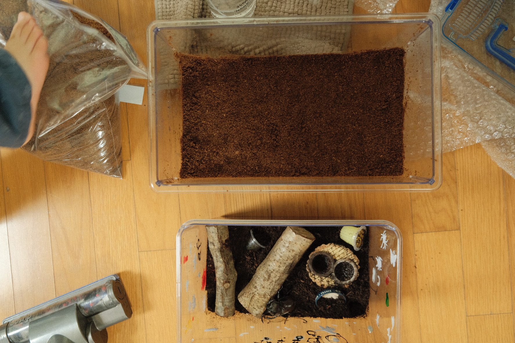그리고 사육함에 넣고 톱밥을 살짝 눌러줘야지 알을 낳는다고 하길래 꾹꾹 눌러주면서 세팅했어요