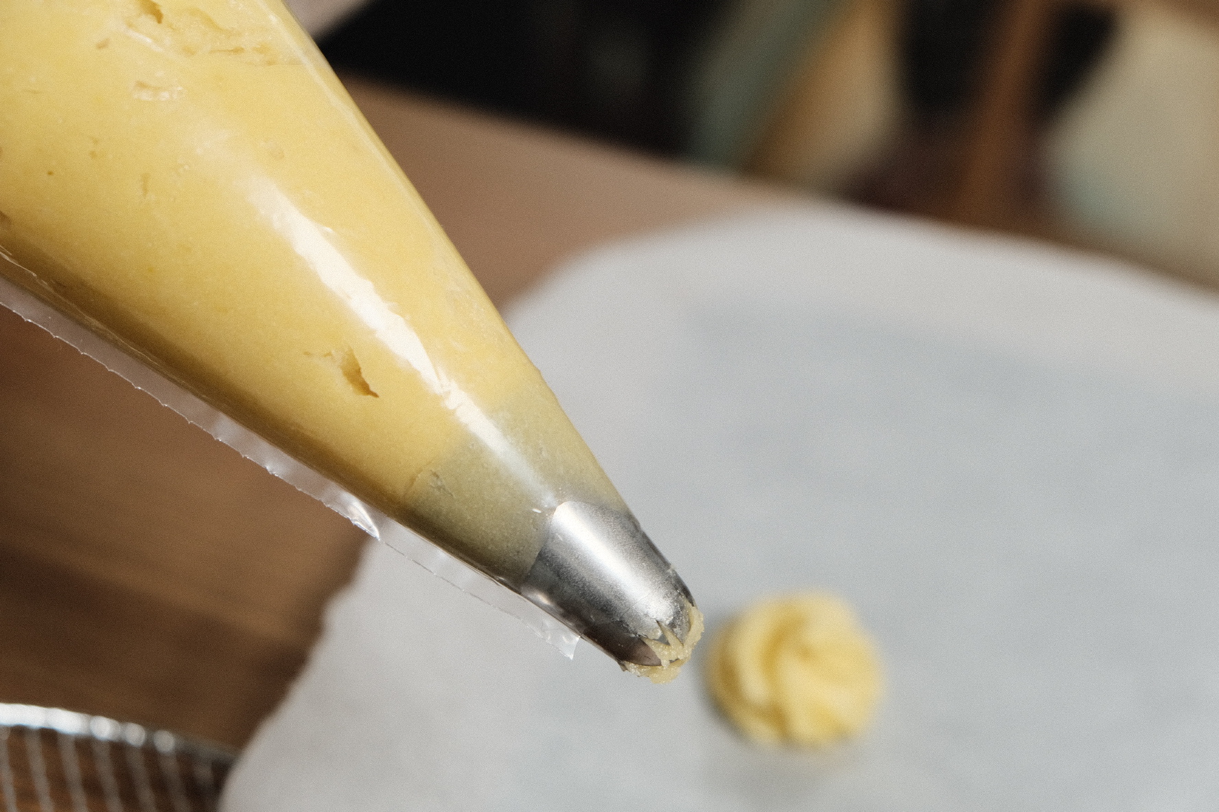 반죽을 잘 섞어 주고, 짤 주머니에 넣었습니다.