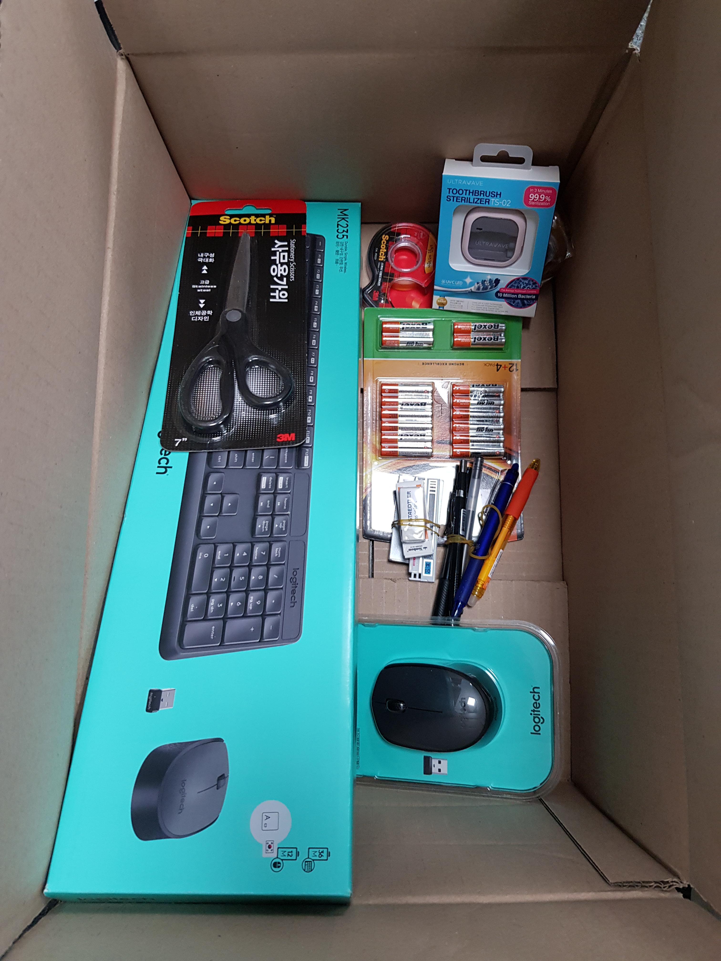 구매한거 보시면, 사무용가위, 스카치테이프, AA 건전지(무선 키보드/마우스 용), 볼펜, 샤프, 지우개 등등 구매했습니다.