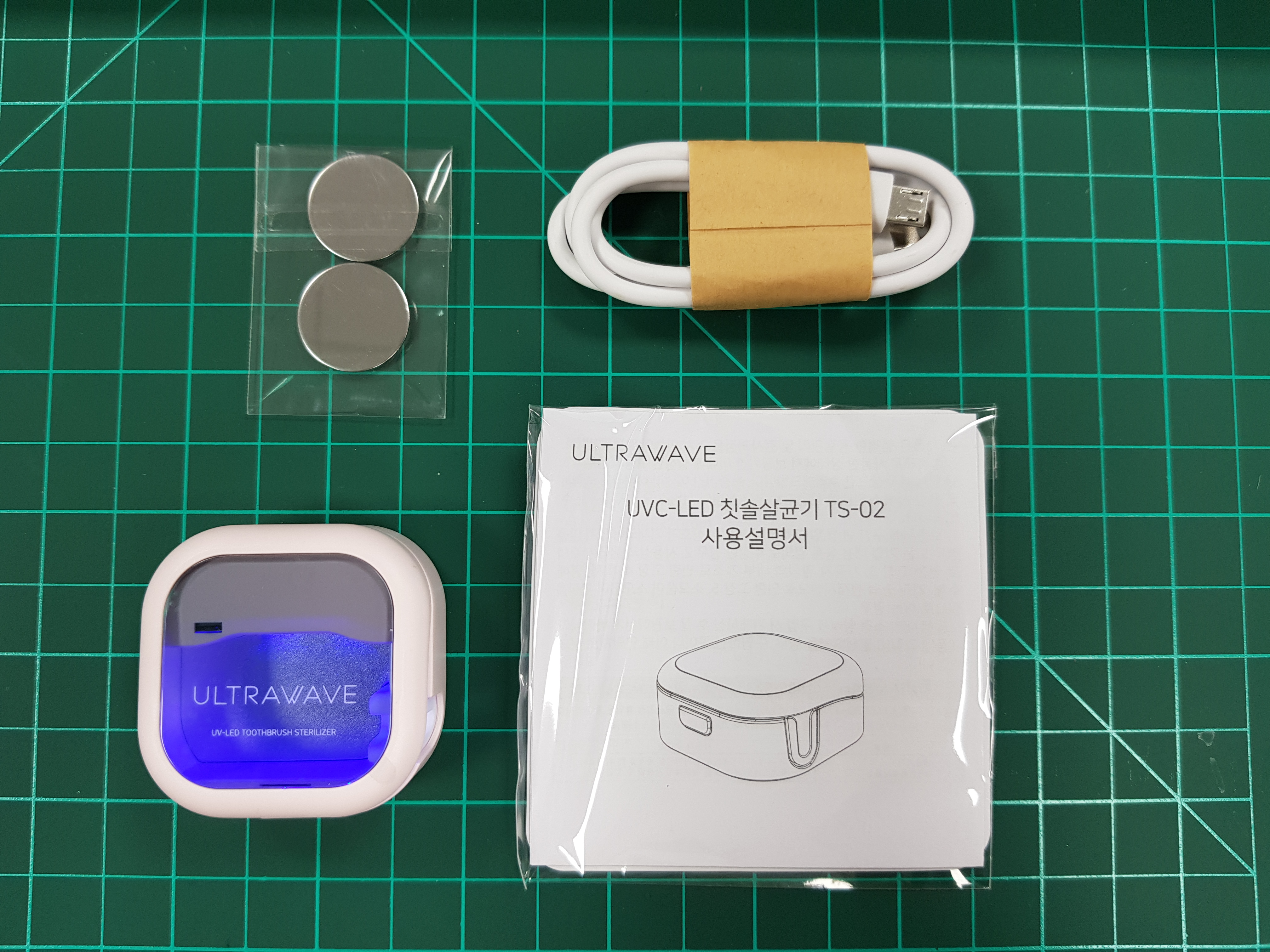 구성은 살균기 본체, 자석(건전지 아님), 충전잭, 설명서가 있었어요.