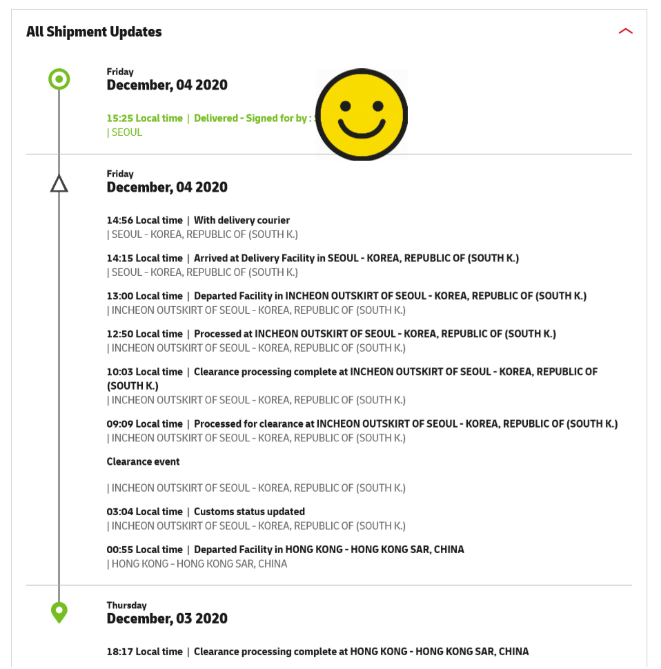 제 배송은 이틀 걸렸는데, 특이하게 중국(선전)에서 홍콩으로 갔다가 홍콩에서 한국으로 들어오네요.