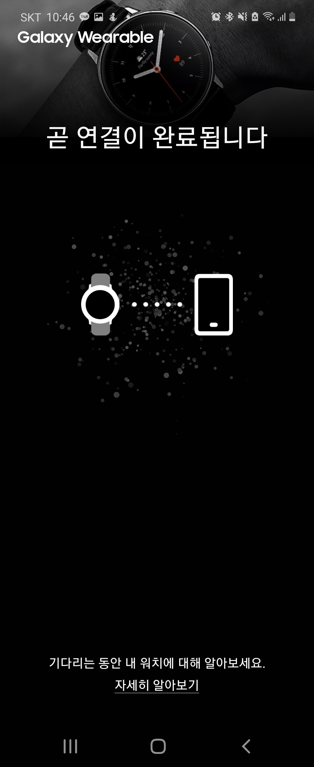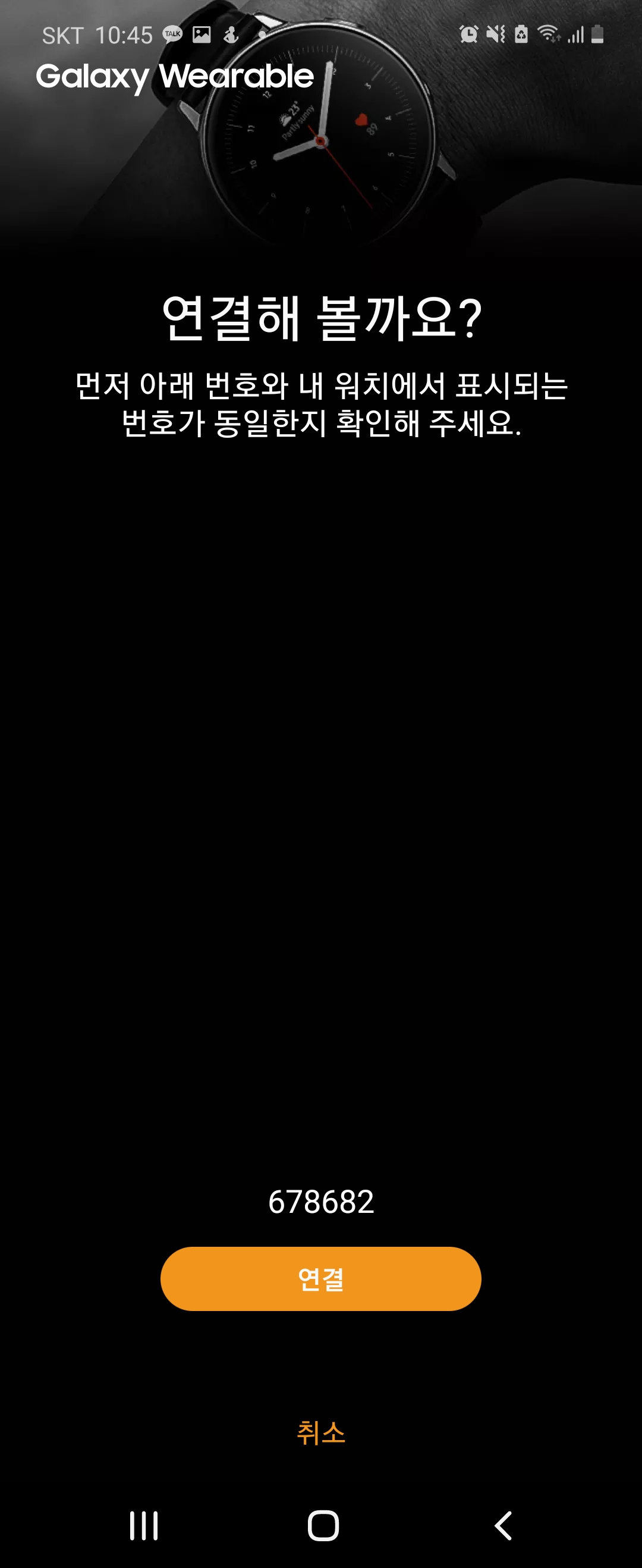 앱 깔아서 연결해주면 이렇게 번호가 뜨는데 서로 일치하는지 확인하고, 핸드폰과 와치 각각 연결 버튼을 눌러줬어요.