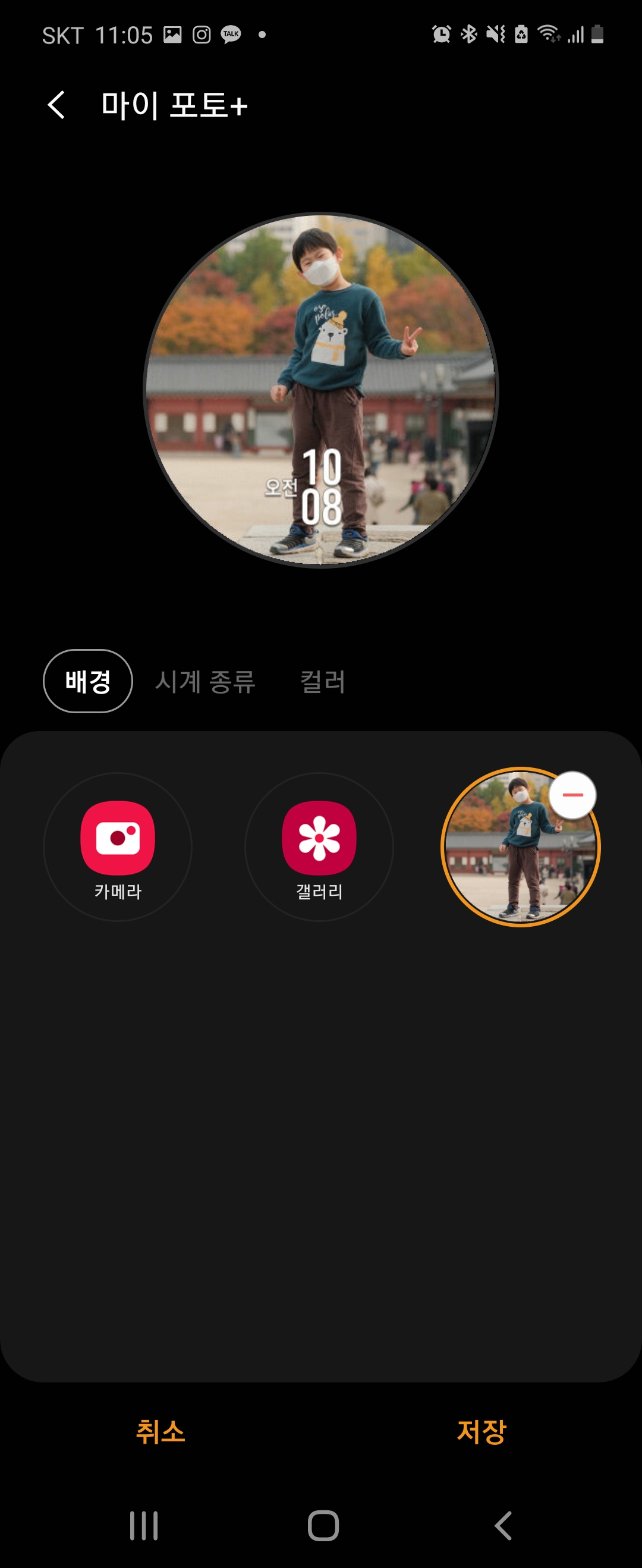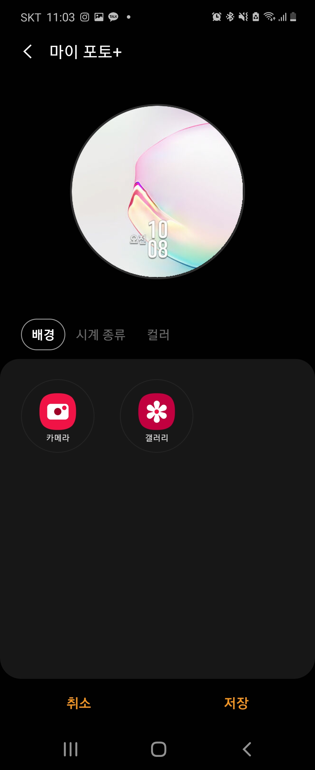 시계 배경이 여러 가지 옵션들이 있었는데 마이 포토에서 이미지를 불러오거나 바로 찍어서 올릴 수 있는 것도 있었어요.
