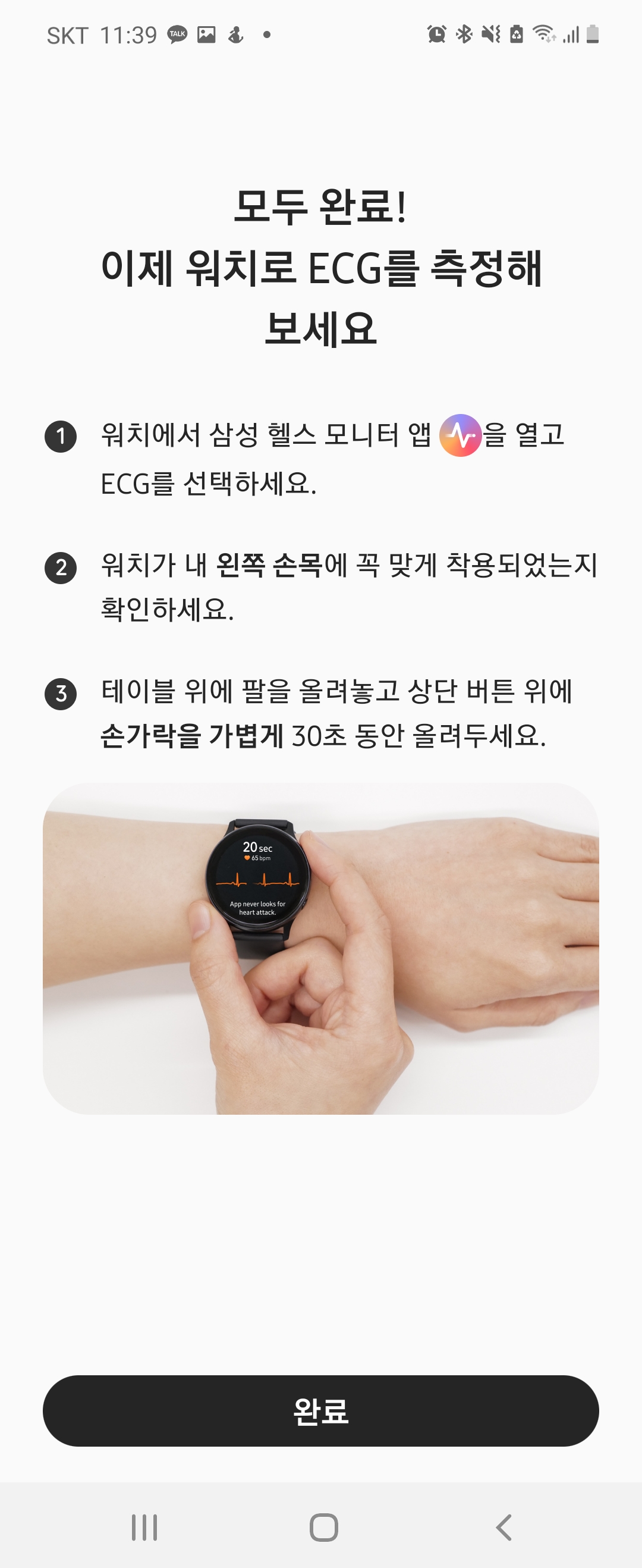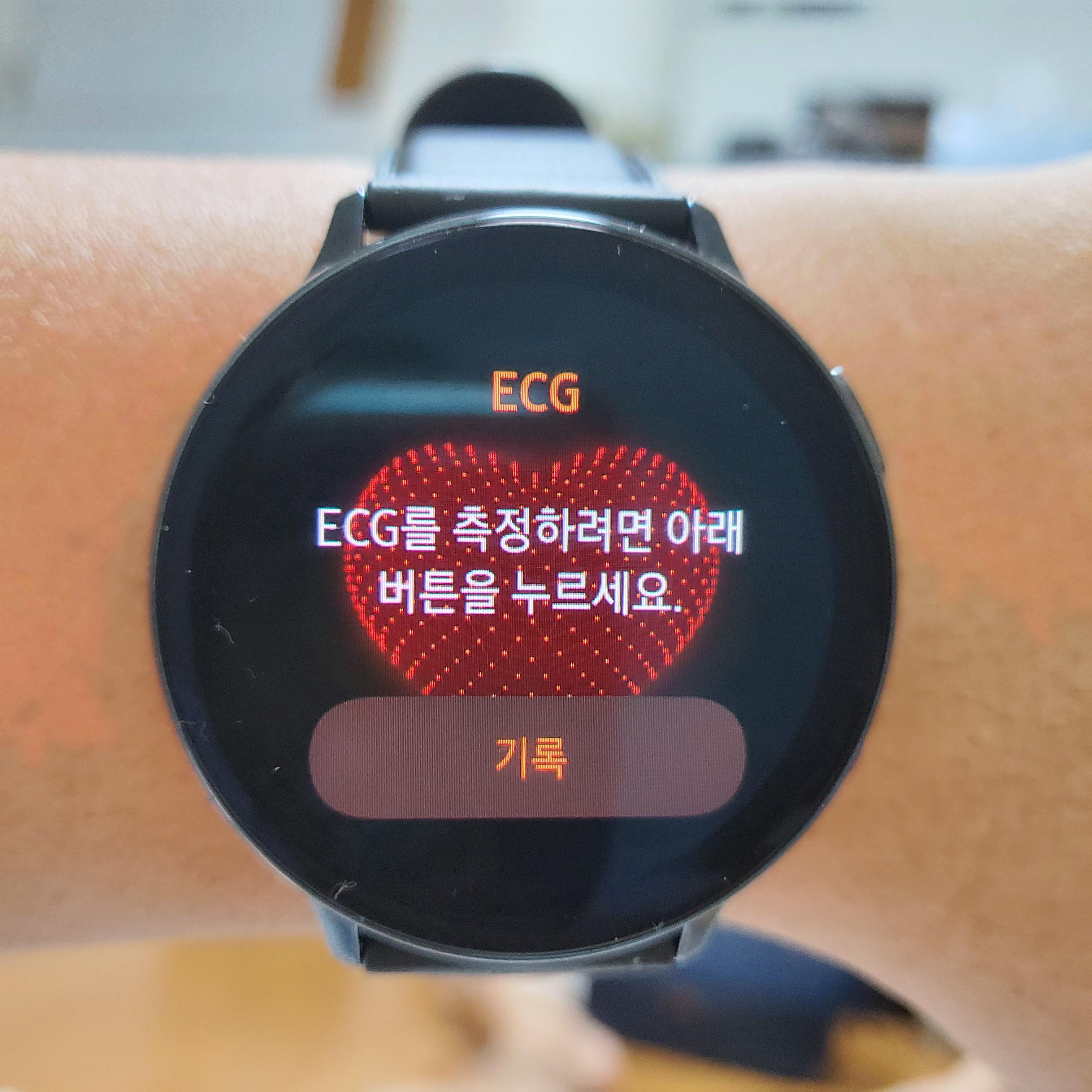 ECG 측정을 누르고, 오른쪽 위에 있는 버튼에 손가락을 올려두면 측정되었습니다.