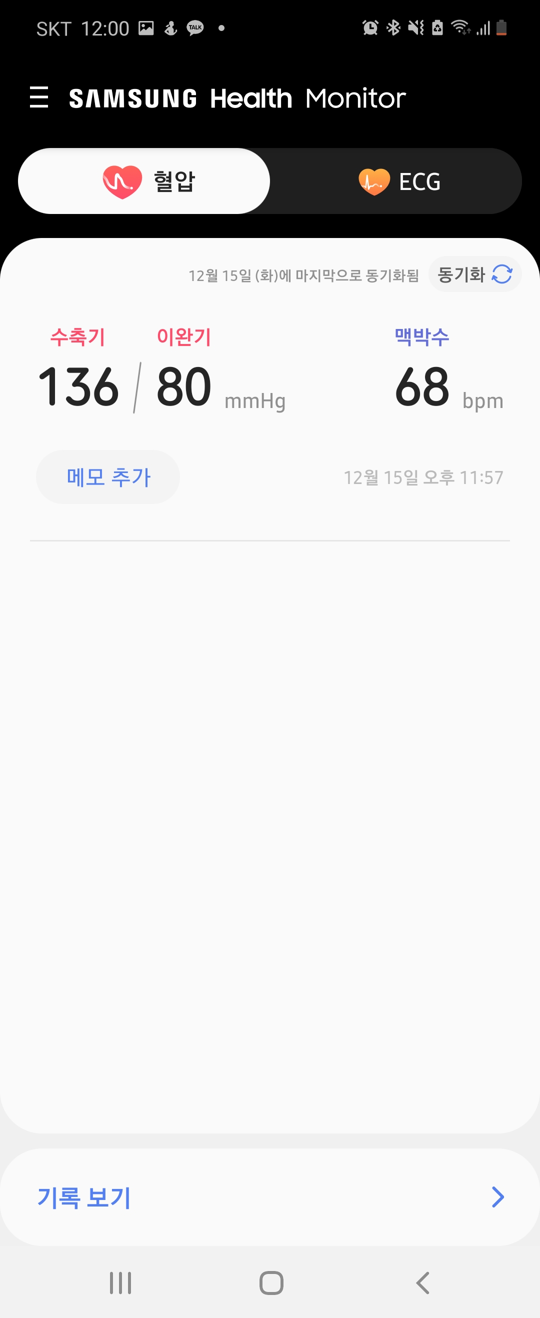 오늘 컨디션이 안 좋아서 운동은 쉬어서 운동 모드는 안 해봤고요, 대신에 혈압과 ECG를 측정해봤습니다.