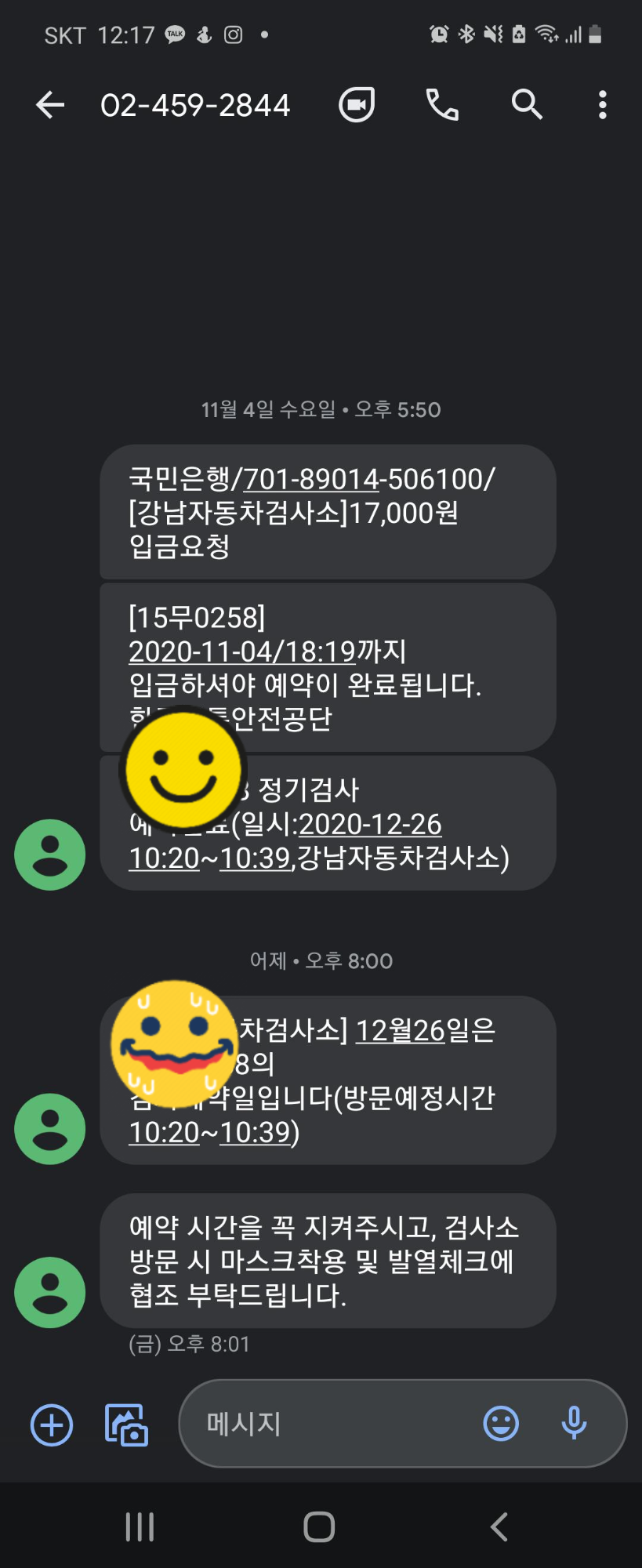 가상계좌를 받아서 미리 결제하였고, 검사 하루 전날 사전에 SMS 로 알람을 해주셨어요.