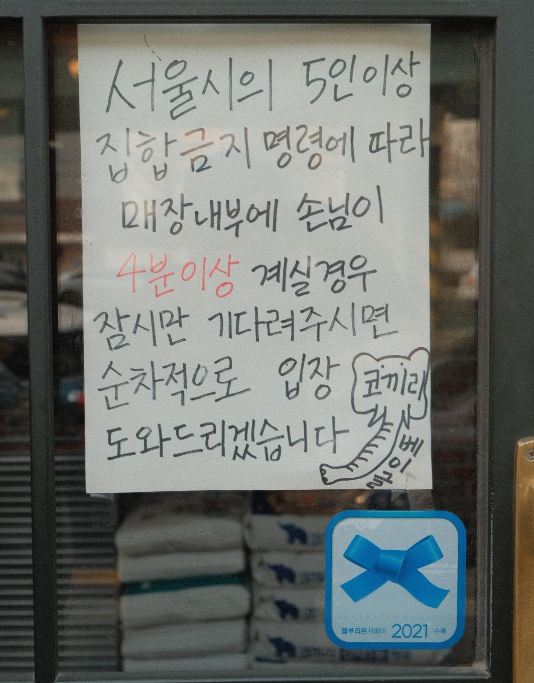 문 앞에 도착하니 5인 이상 집합 금지 때문에 테이크아웃도 4명씩만 식당에 들어갈 수 있게 되어 있었어요.