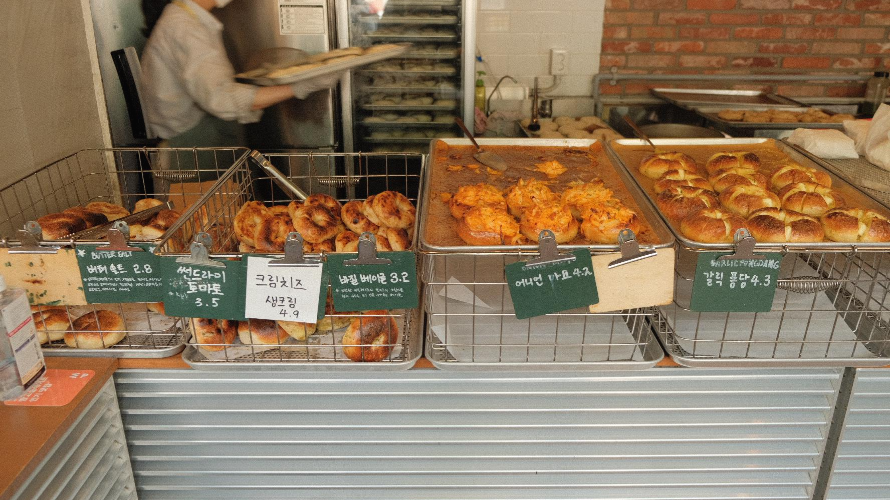 쫄깃한 베이글이 막 구워낸 것을 먹을 때가 제일 맛있어요. 바로 먹을 만큼만 사서 드시는 걸 추천해 드려요.