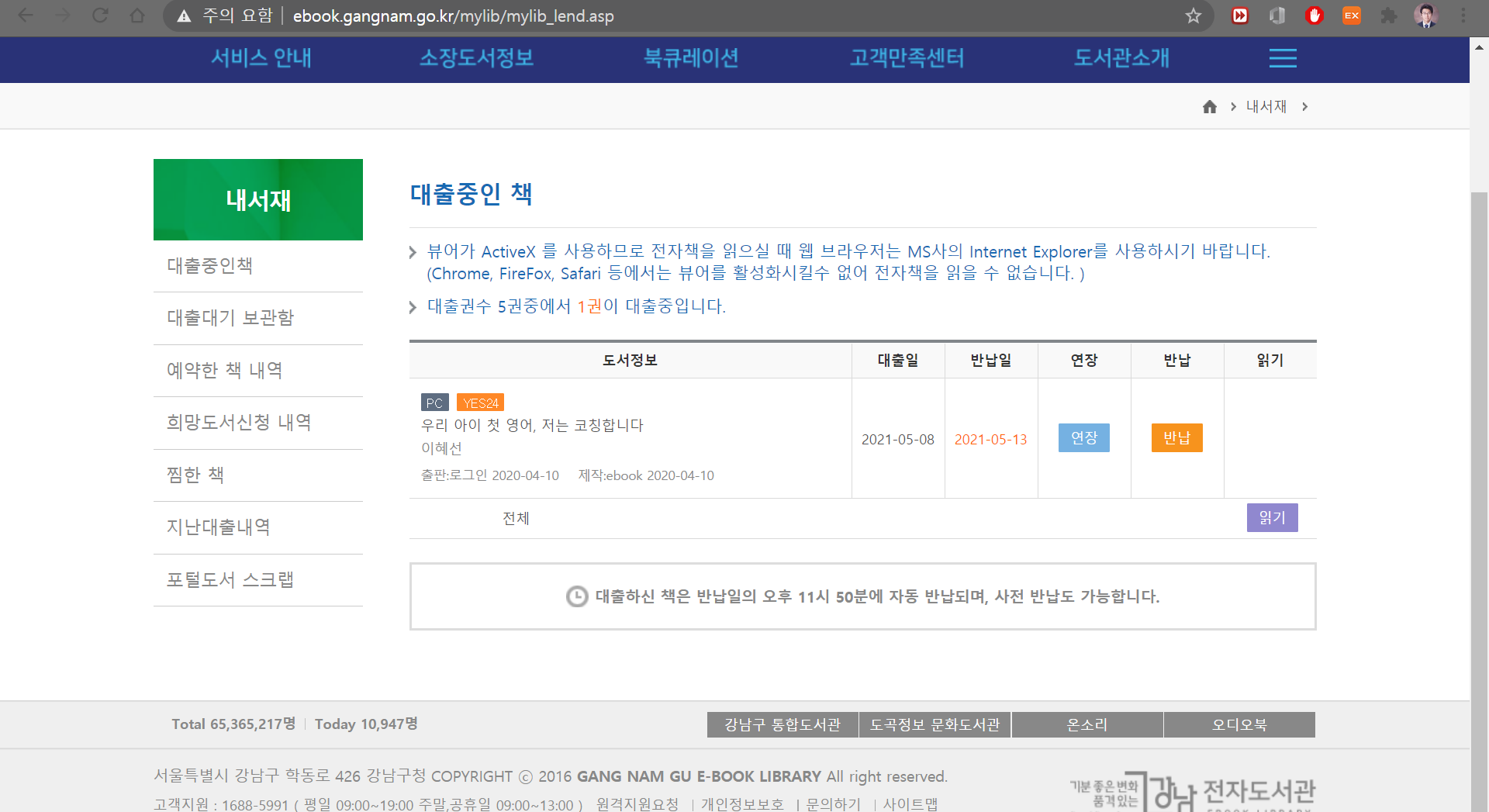 책 대여는 아래와 같이 홈페이지에서도 조회 가능하고, 연장이나 반납도 가능했어요.