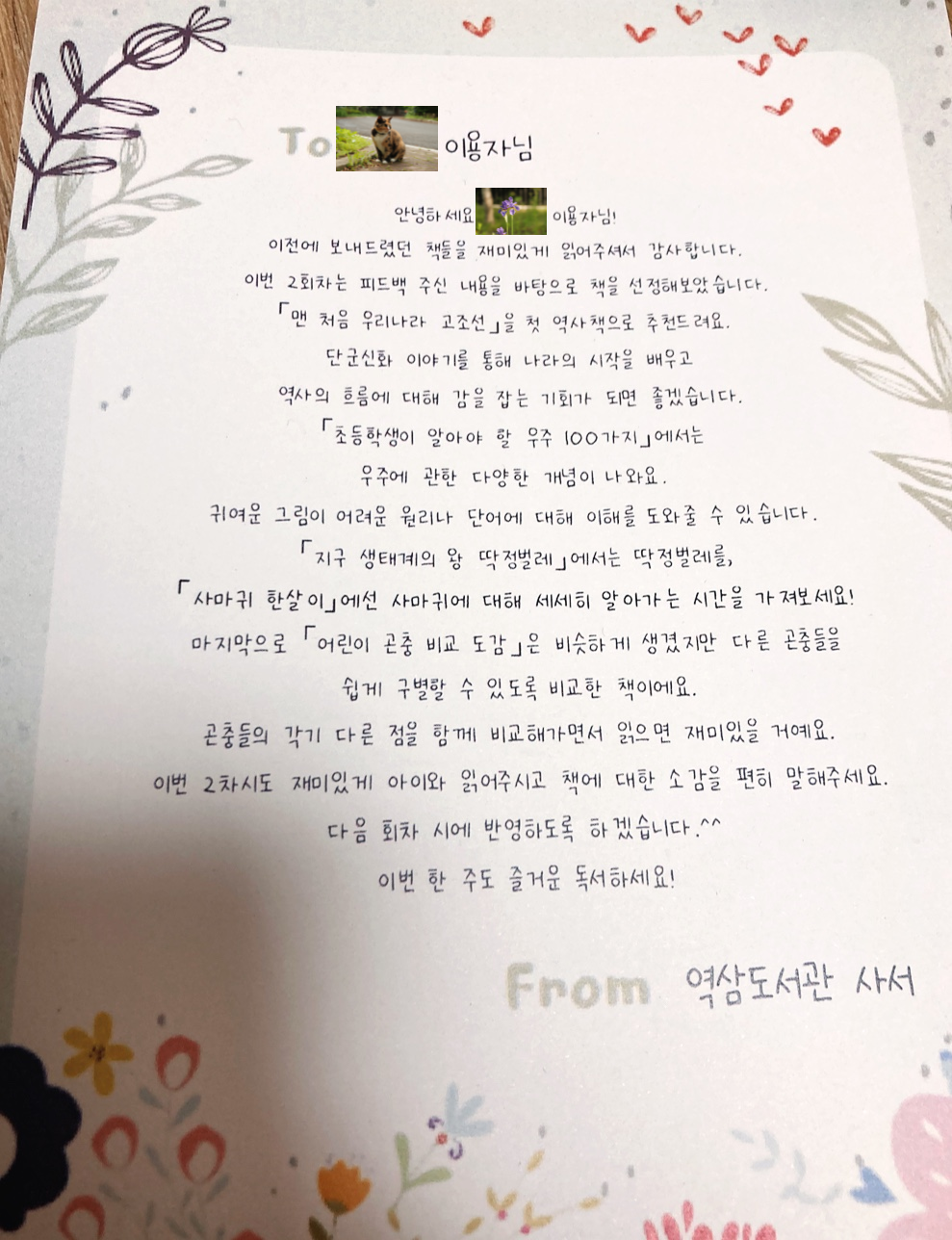 매주 한번씩 사서가 전화와서는 빌려드린 책이 어땠는지 다음엔 어떤 카테고리의 책을 빌려주실지 상담해주셨어요!!!