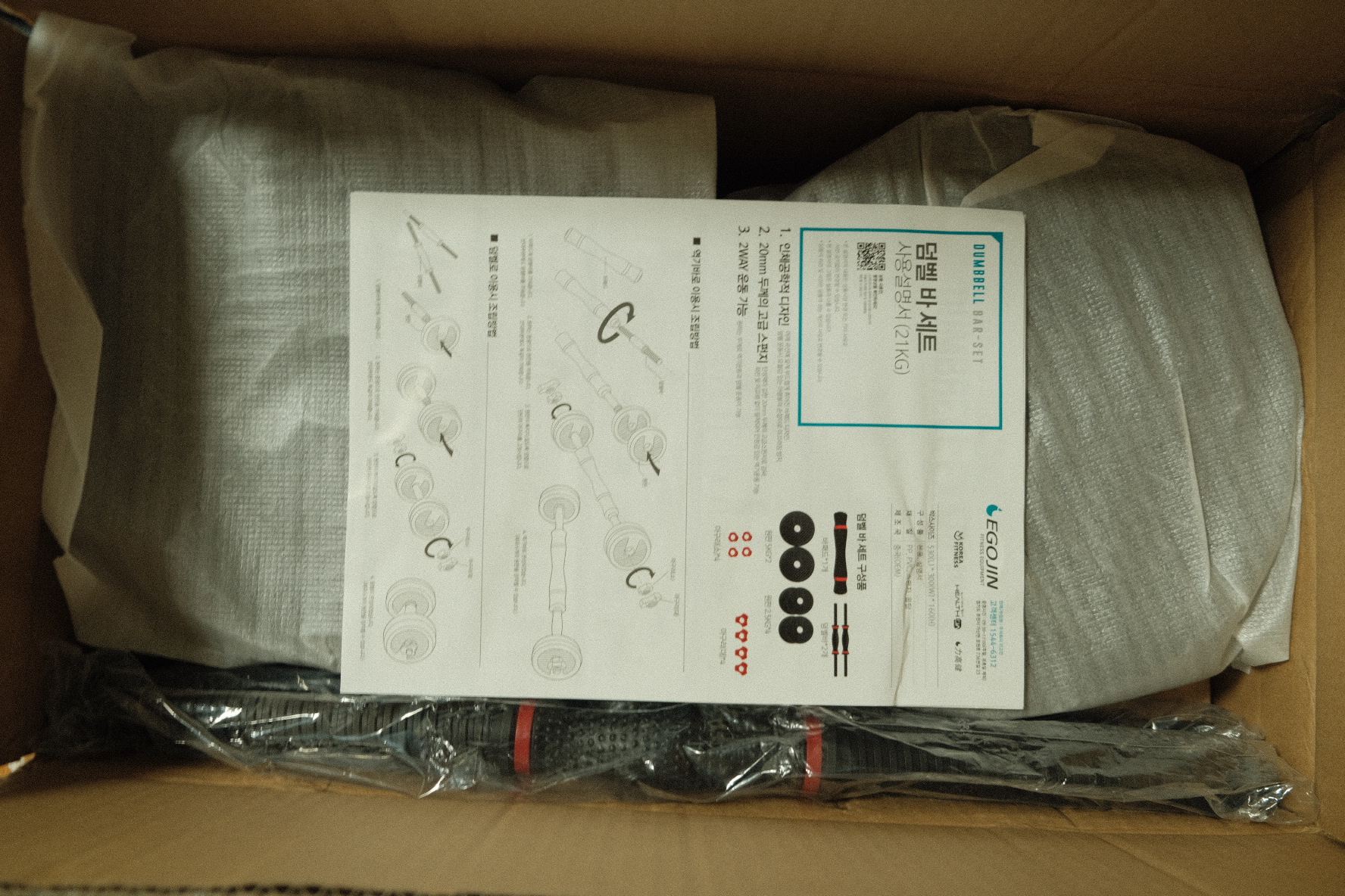 안에 덤벨 바가 두 개 보이고, 그 옆에 덤벨 원판들이 잘 포장되어 있었어요.