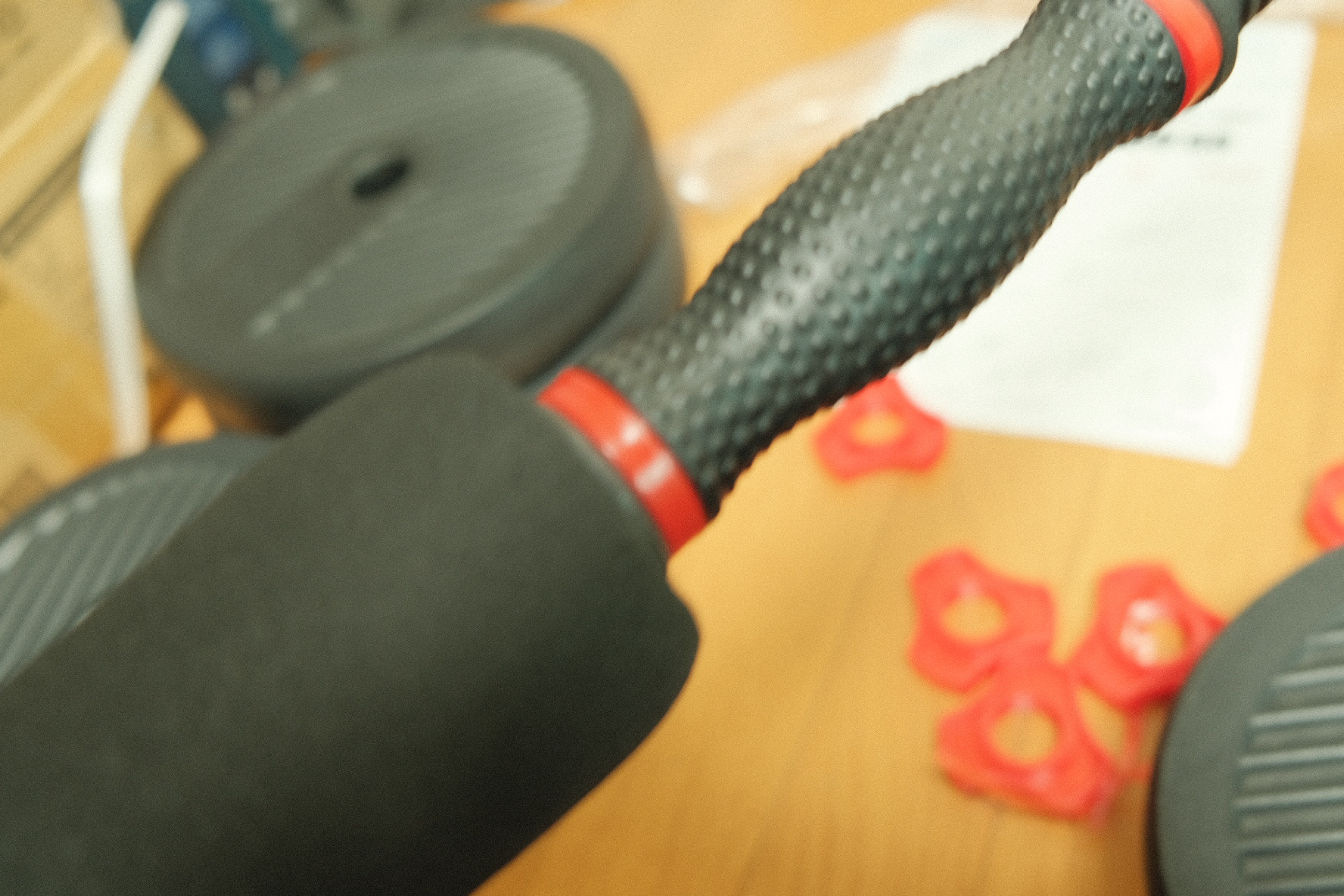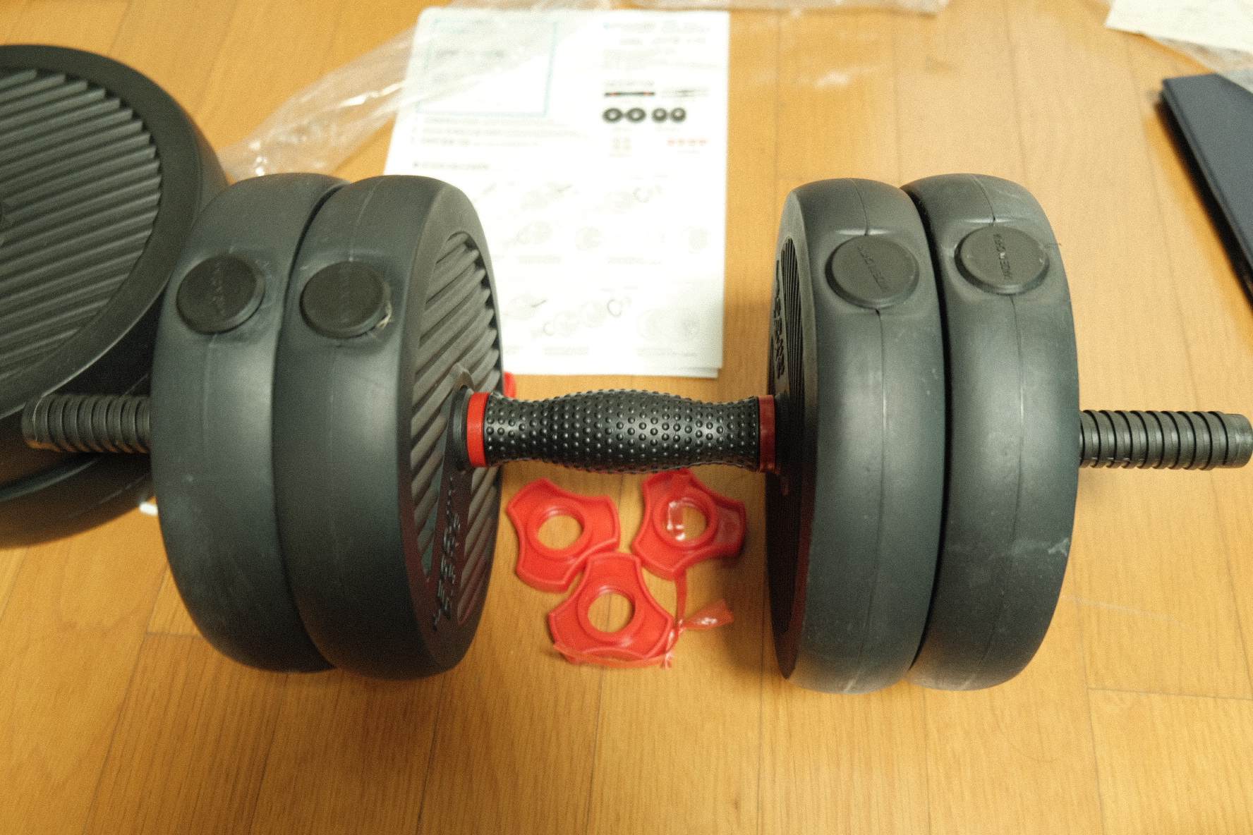 위 사진 빨간 마구리를 보면 가운데가 살짝 동그랗게 돌출되어 있는데, 이 마구리를 끼우면 덤벨이 흔들리지 않고 고정이 되네요.