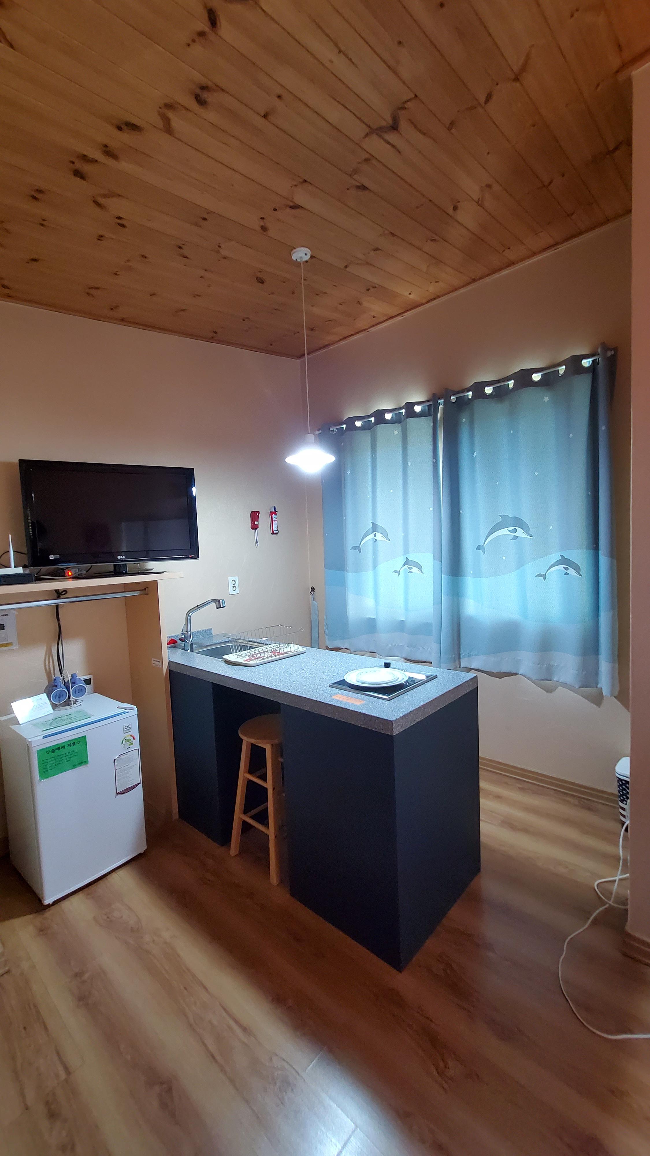 작은 냉장고가 하나 있고, 아일랜드 식탁 아래에 전자레인지도 있었어요.