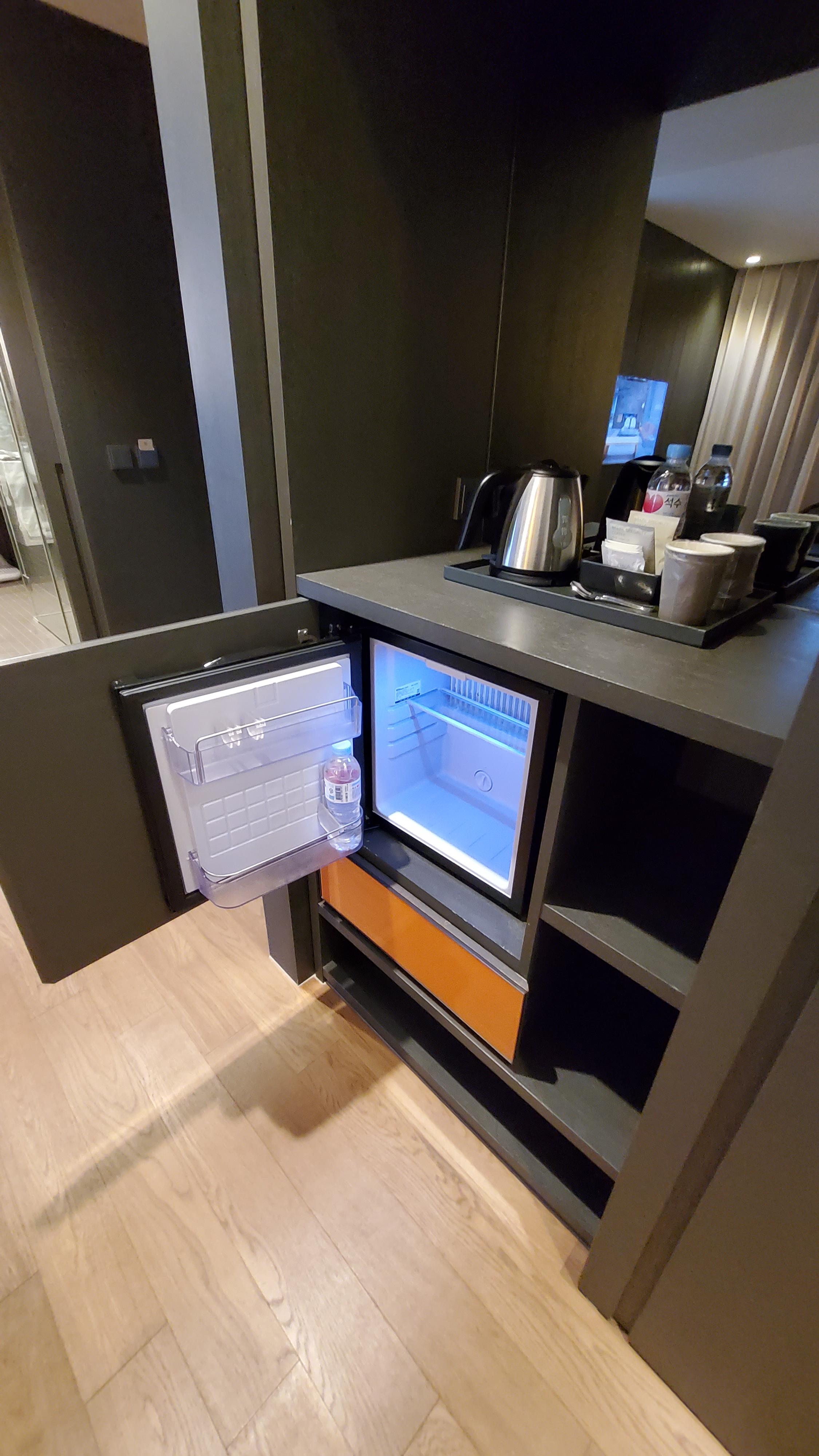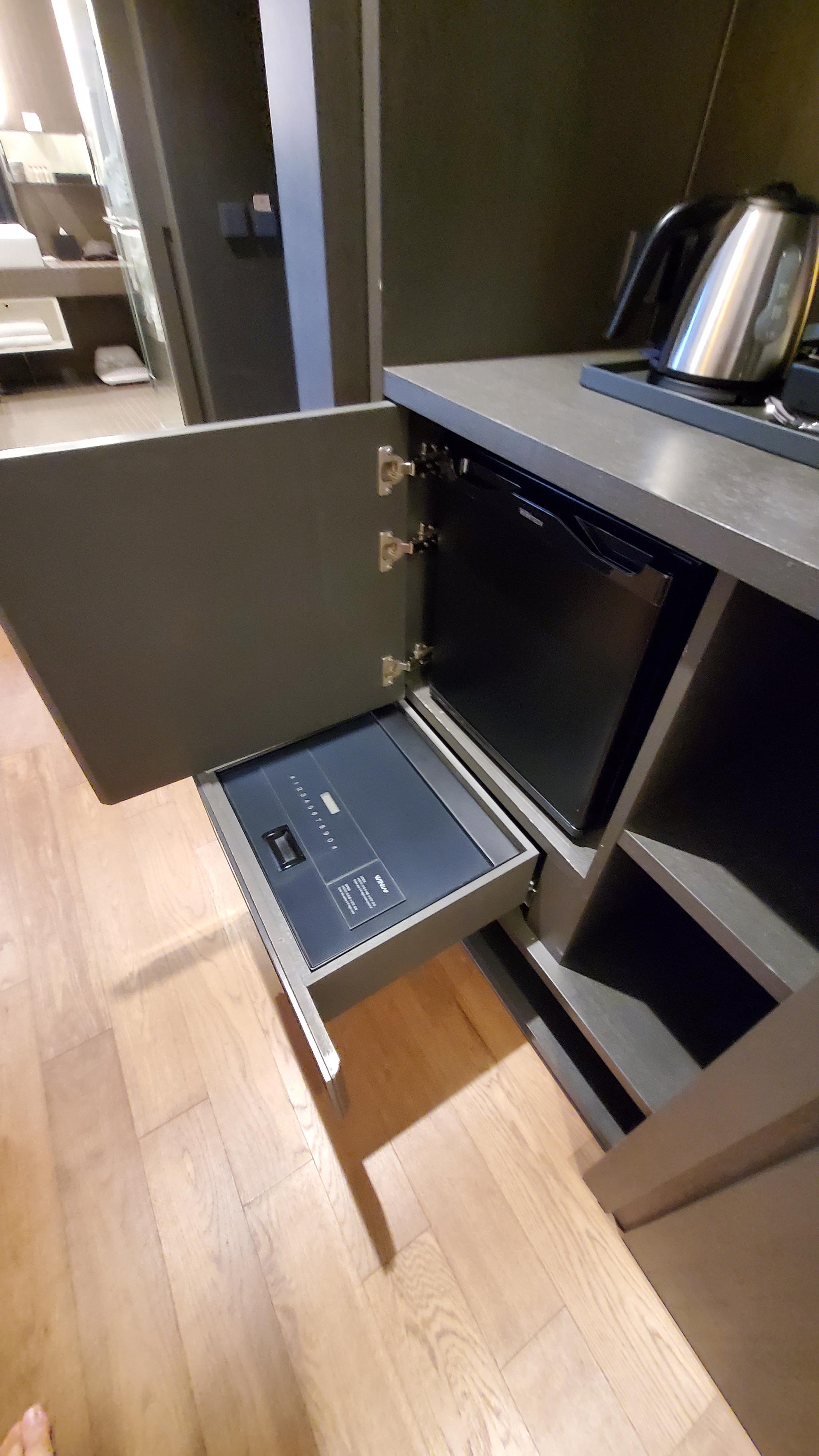 냉장고는 이렇게 문을 열면 안에 있고, 아래에는 개인금고가 있었어요