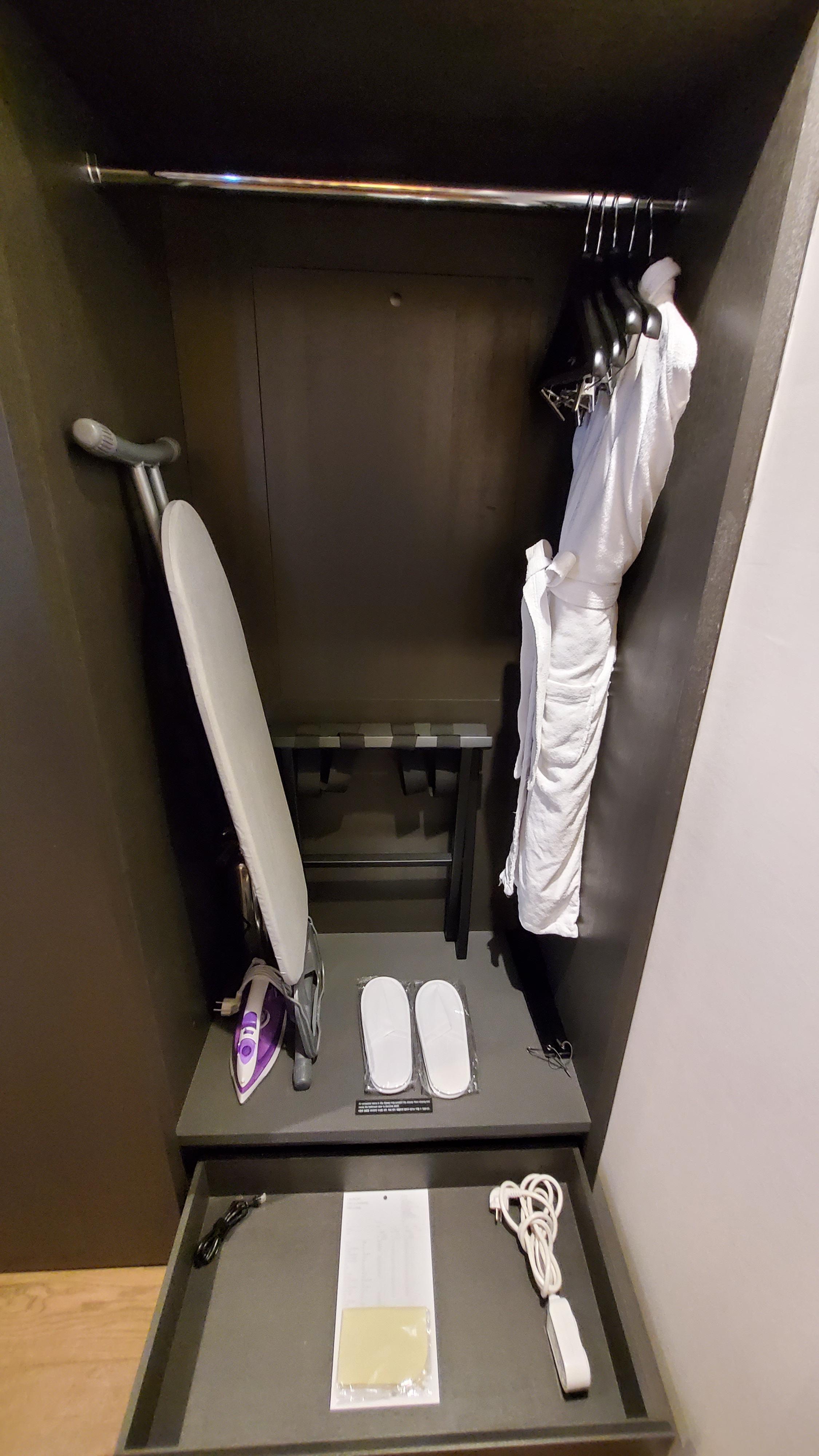 그 옆에 옷장을 열어보면, 아까 말씀드린 샤워가운과 다리미와 슬리퍼가 보이고요